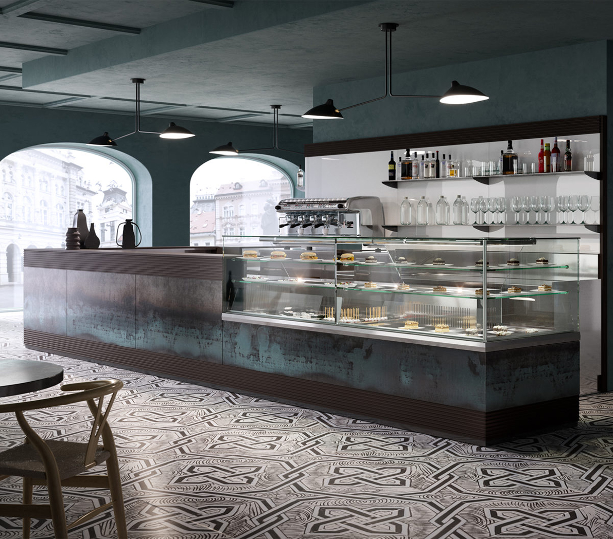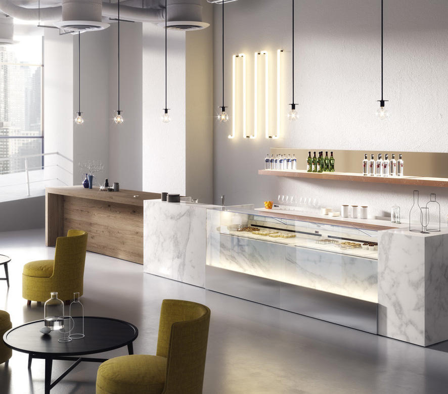 Nasce dalla volontà di ottenere un elemento tecnologico e sensoriale dove la fusione e l’integrazione tra il banco bar e le vetrine refrigerate genera una forma unitaria pura, semplice ed essenziale. Un blocco monolitico come fosse lavorato da un pieno, da un massello di pietra.