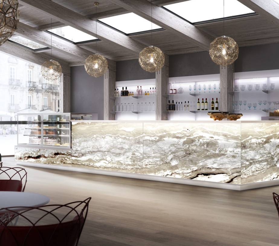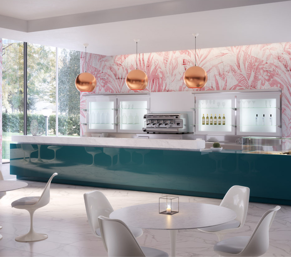 Il colore diventa comunicazione, espressività di un locale dinamico, vivo e mutevole in base all’orario della giornata per offrire il meglio in ogni momento e occasione. Al colore dei materiali traslucidi impiegati per la realizzazione del pannello frontale e dei fianchi, si abbina l’effetto prodotto della retro illuminazione a LED