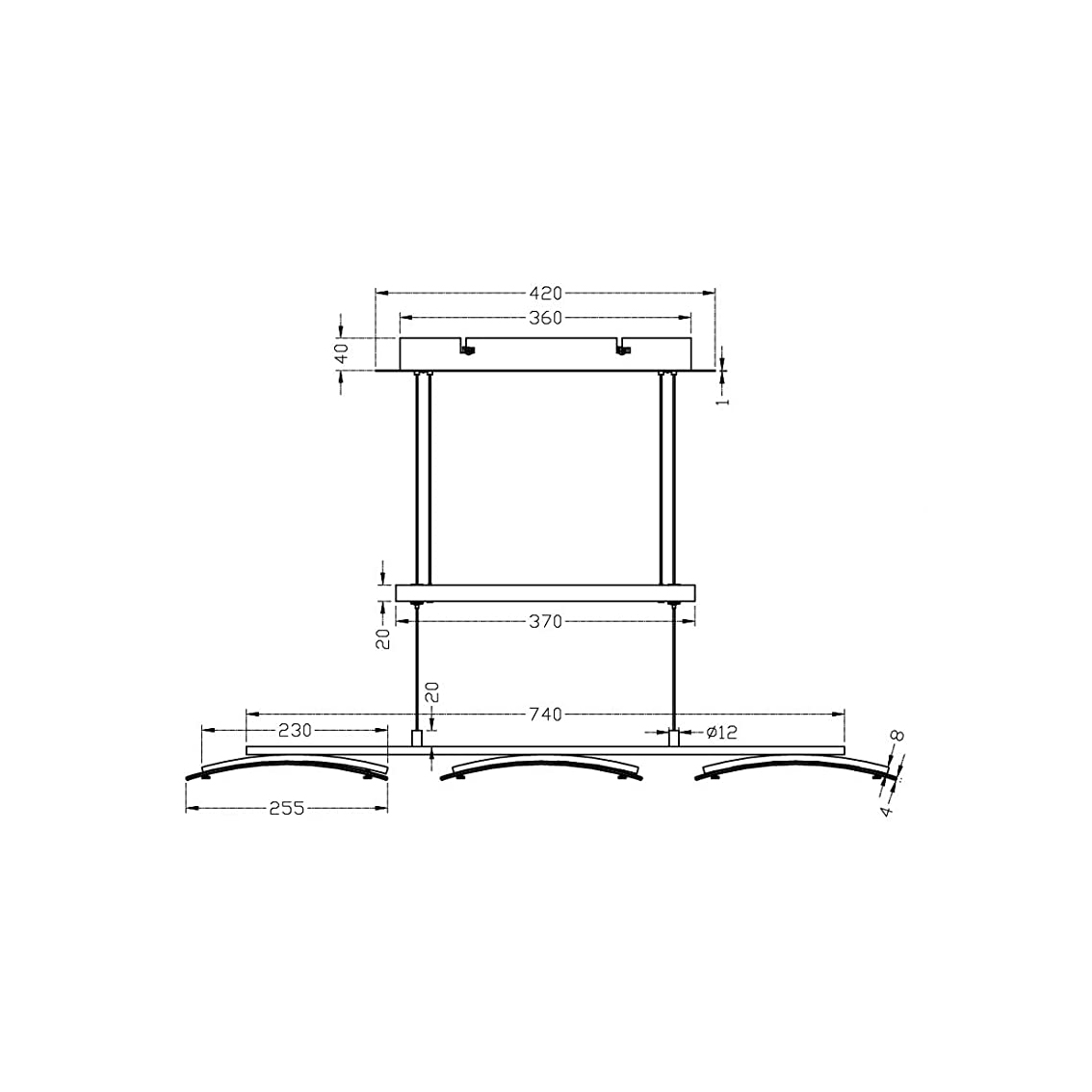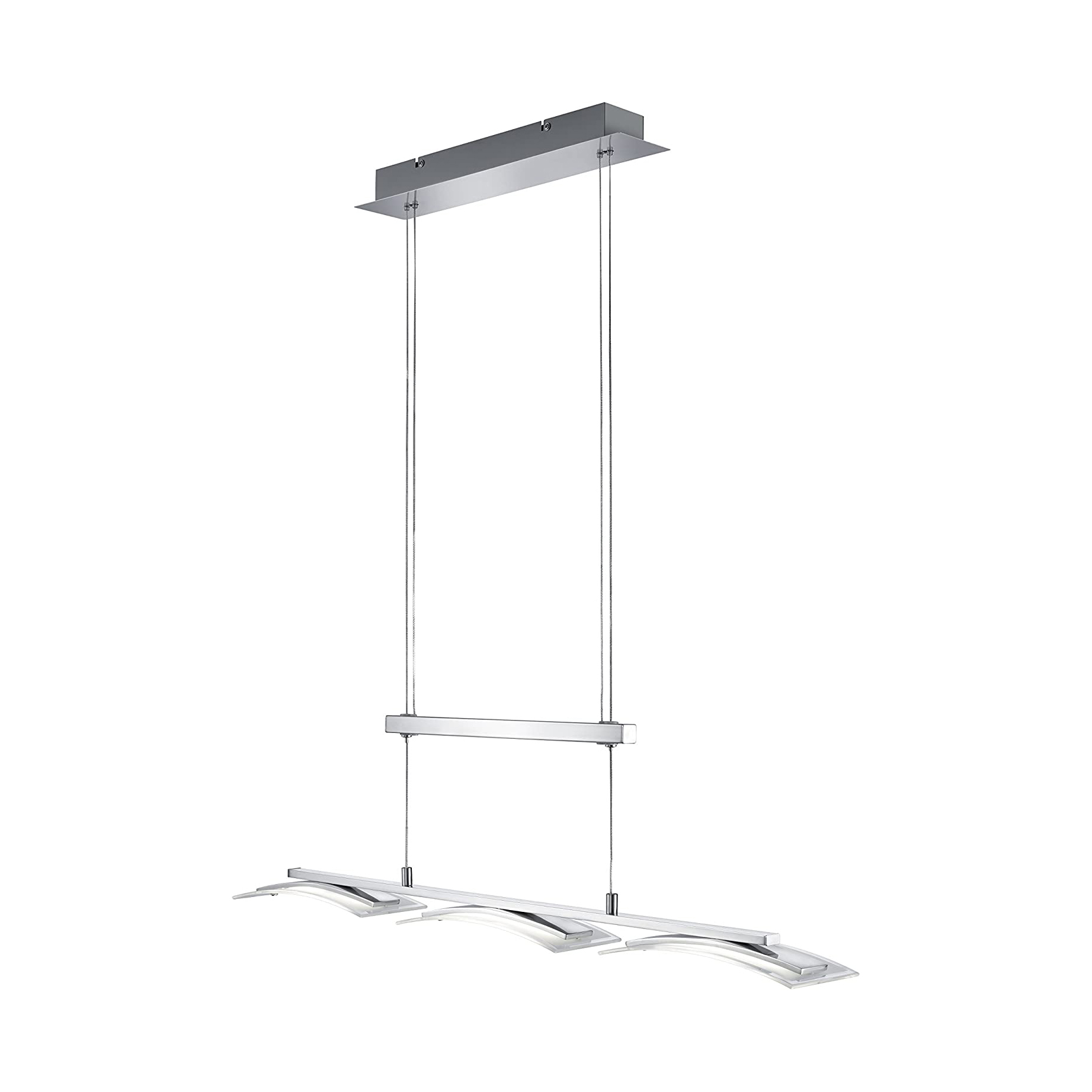 Lampada a sospensione a tre luci, in acciaio opaco e vetro satinato chiaro. Lampada regolabile in altezza individualmente da 950 a 1.500 mm. Dimensioni P. 10 x L. 87 x A. 95/150 cm; Peso 2.55 Kg
