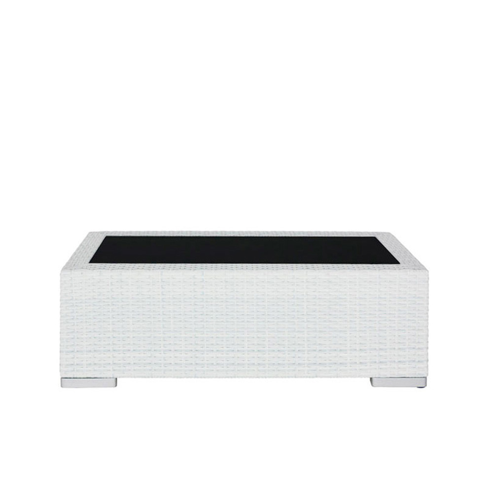 Tavolo basso con struttura in alluminio, rivestimento in filo di polietilene, piano in vetro. Dimensioni L100 x P47 x H33 cm