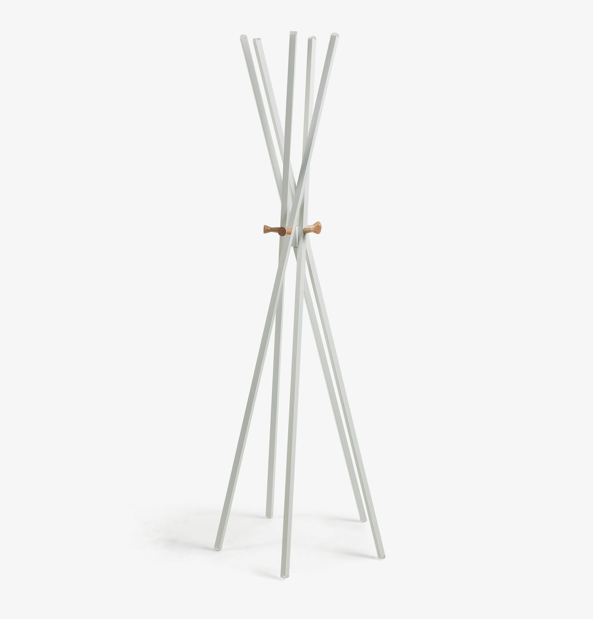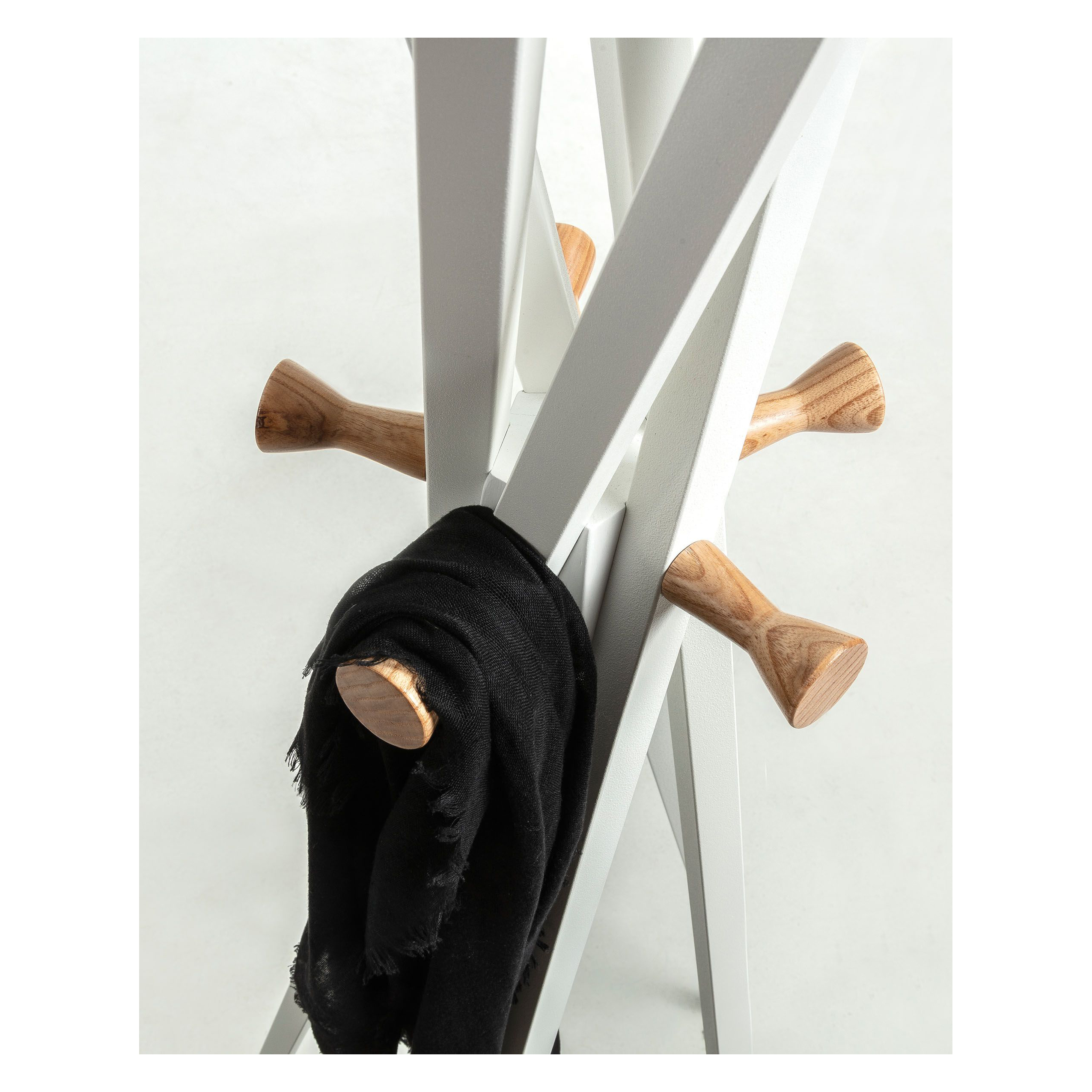 Appendiabiti in profili di alluminio e massello, rifinitura colore bianco opaco e frassino. Ispirato all’iconico appendiabiti sciangai, con il suo stile moderno è perfetto nell’ingresso o nella zona giorno. Dimensioni, altezza 170 cm, profondità e larghezza 60cm