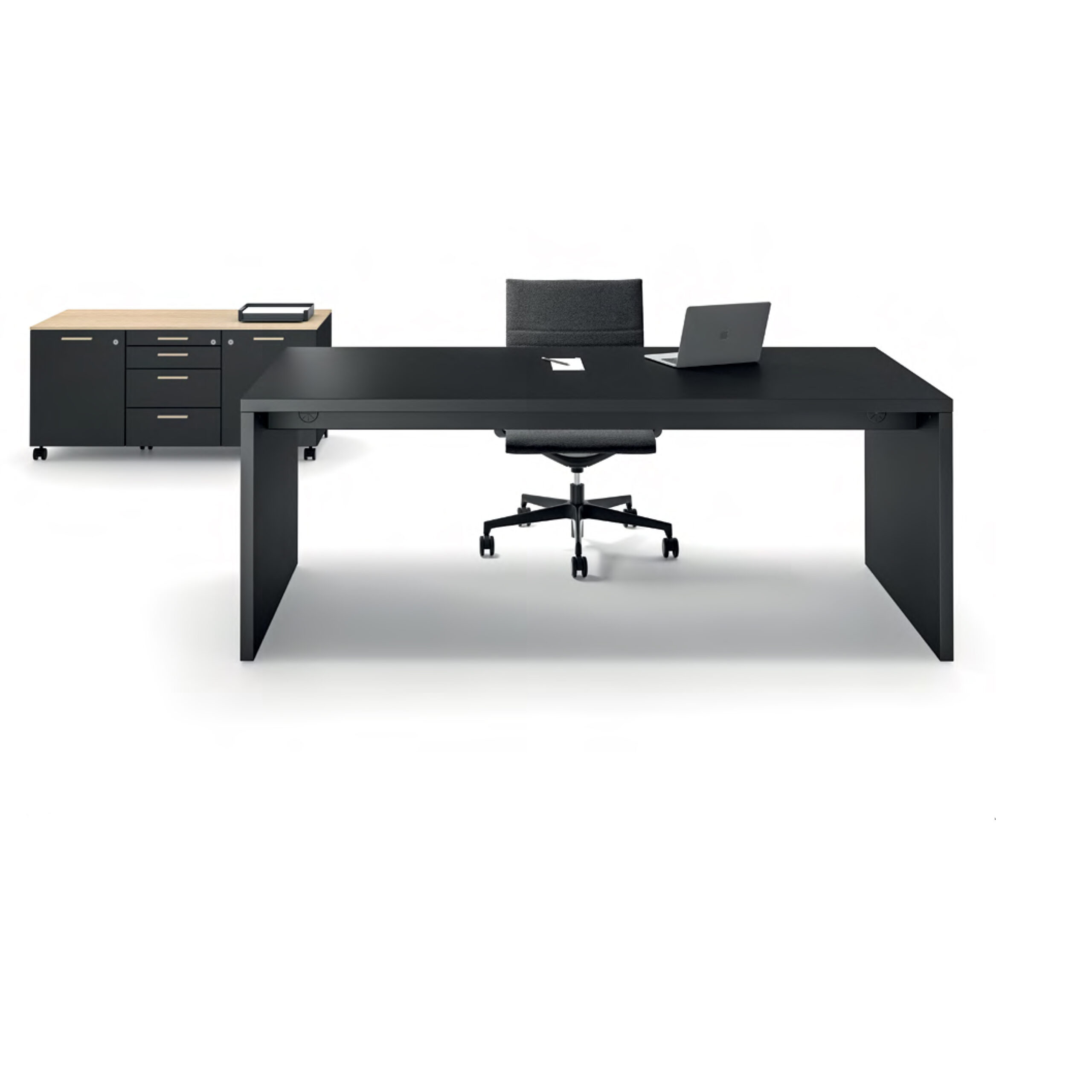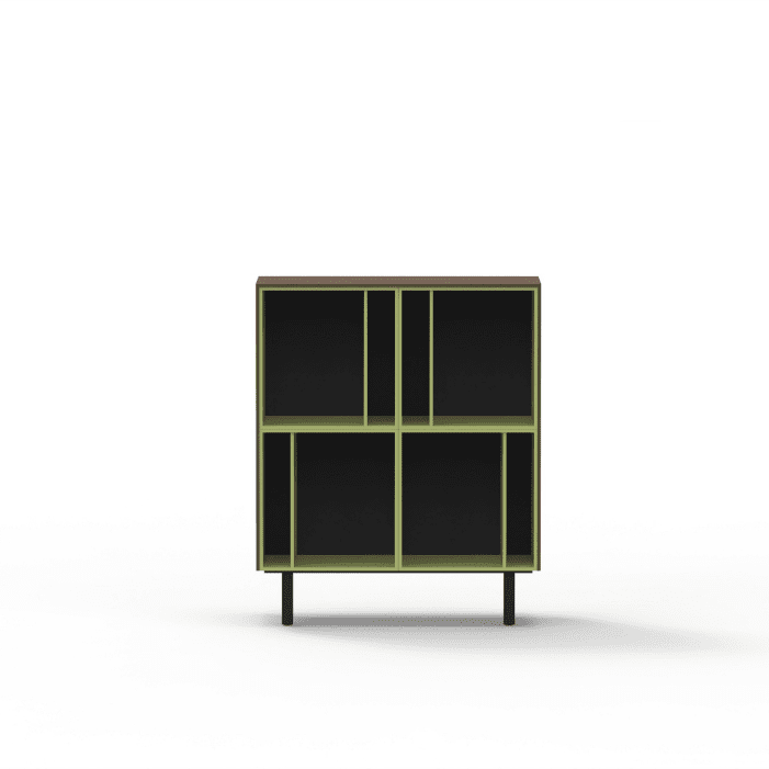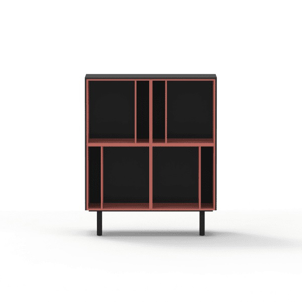 Credenza con quattro vani a giorno e finiture in melaminico, scocca spess. 18 mm. Top e fianchi di chiusura di spess. 12 mm. La struttura è sostenuta da piedini 40 x 40 x h.195 mm. quadrati in abs. Dimensioni : L. 102 x P. 46 x H. 125 cm.