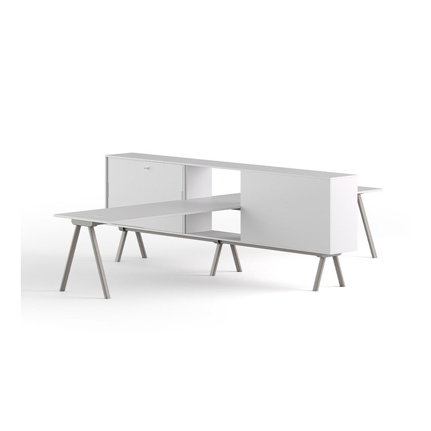 Stazione di lavoro doppia con 2 mobili composti da moduli con ante scorrevoli con serrature e ripiani interni, 1 modulo a giorno con ripiano. piani di scrivania di lavoro dritti di colore bianco, spessore 22 mm.