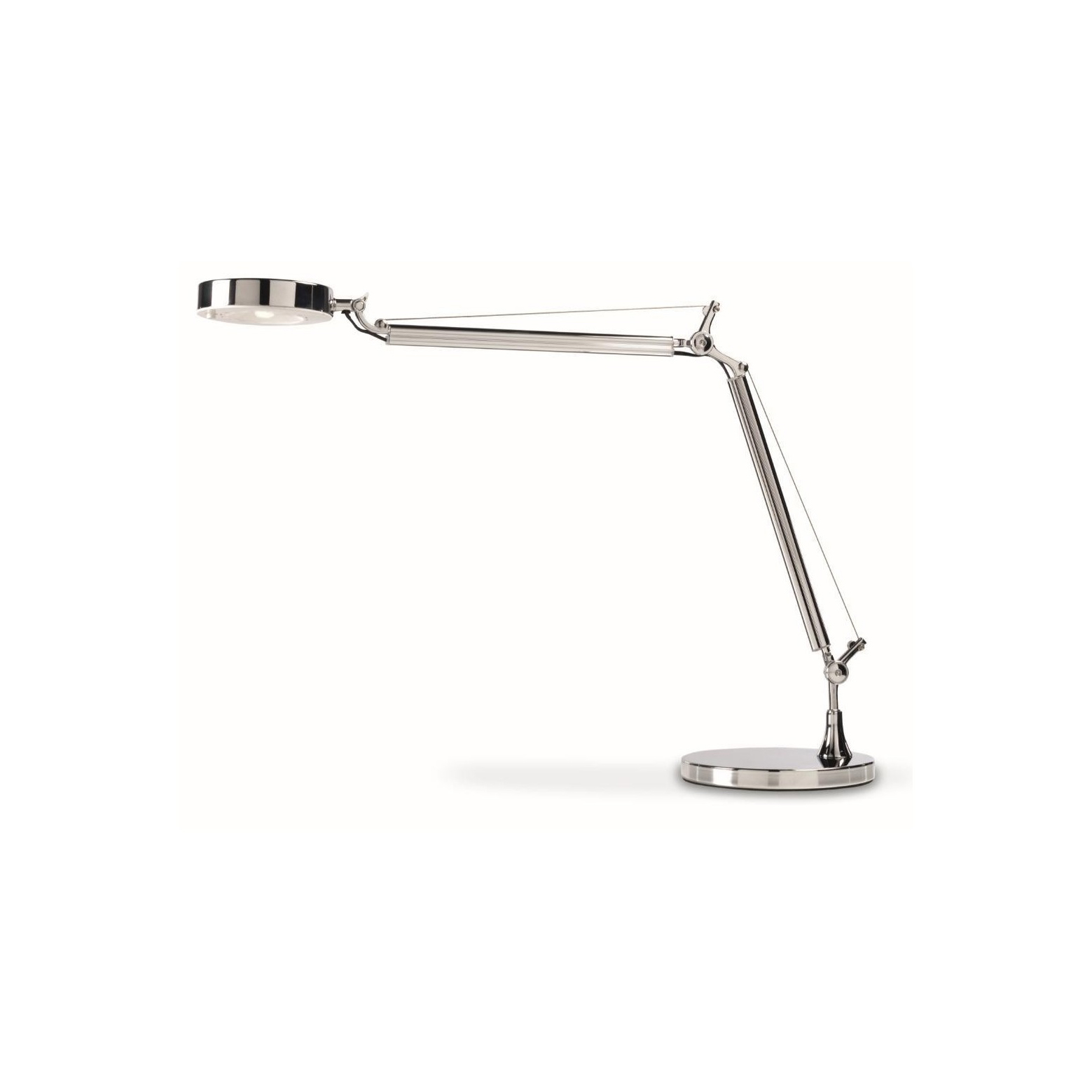 Lampada da tavolo “a pantografo” realizzata in metallo verniciato. Il suo braccio regolabile è bilanciato dalla testa ottica orientabile. Illumina la scrivania grazie a un CoB Led alimentato da un driver integrato. Si completa con un cavo di alimentazione in silicone nero di 150 cm. ed un interruttore on/off posizionato sotto la testa del corpo lampada. Sorgente led da 5W a tonalità naturale. Rifinitura colori bianco, cromato