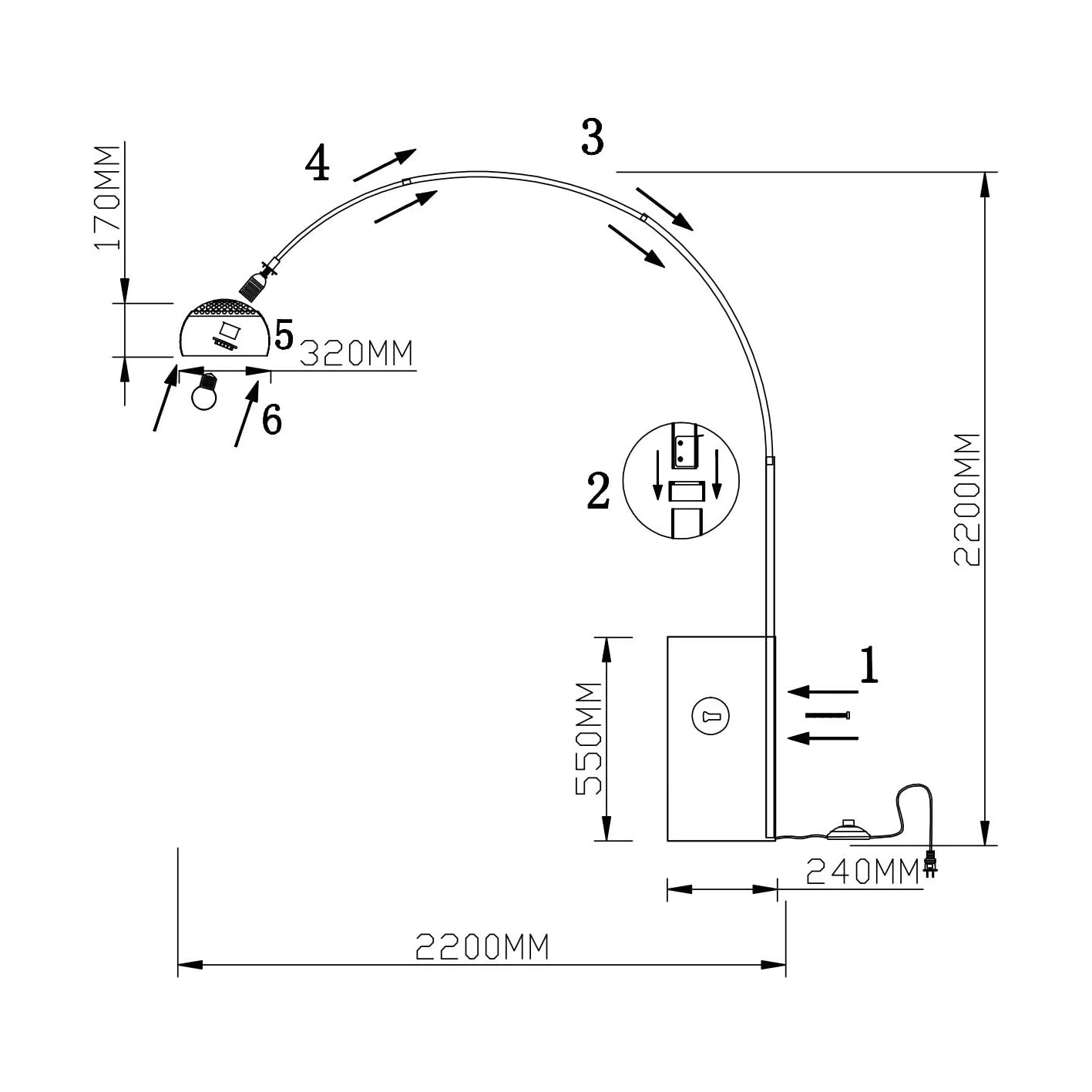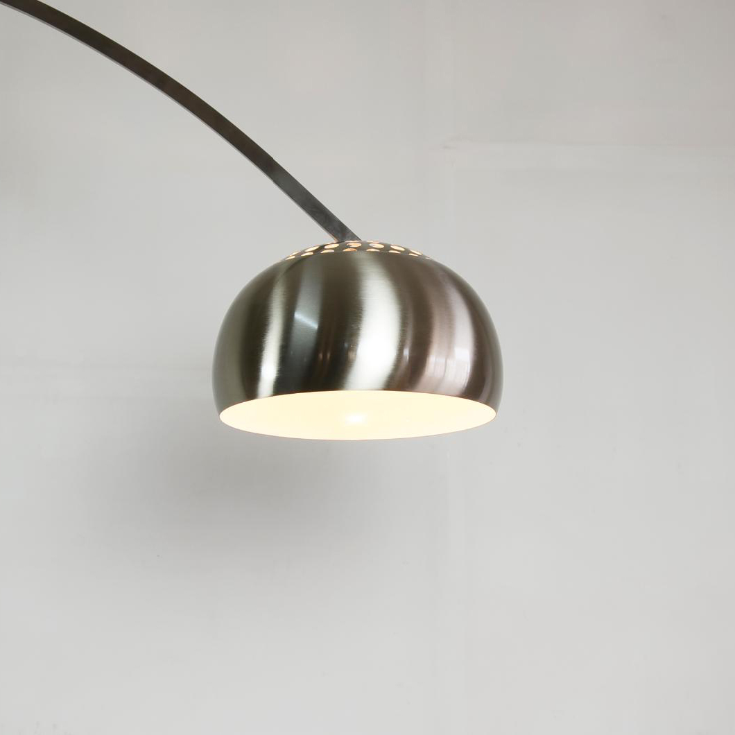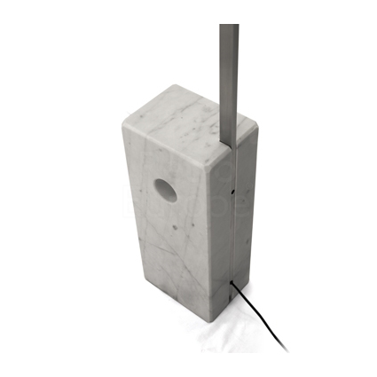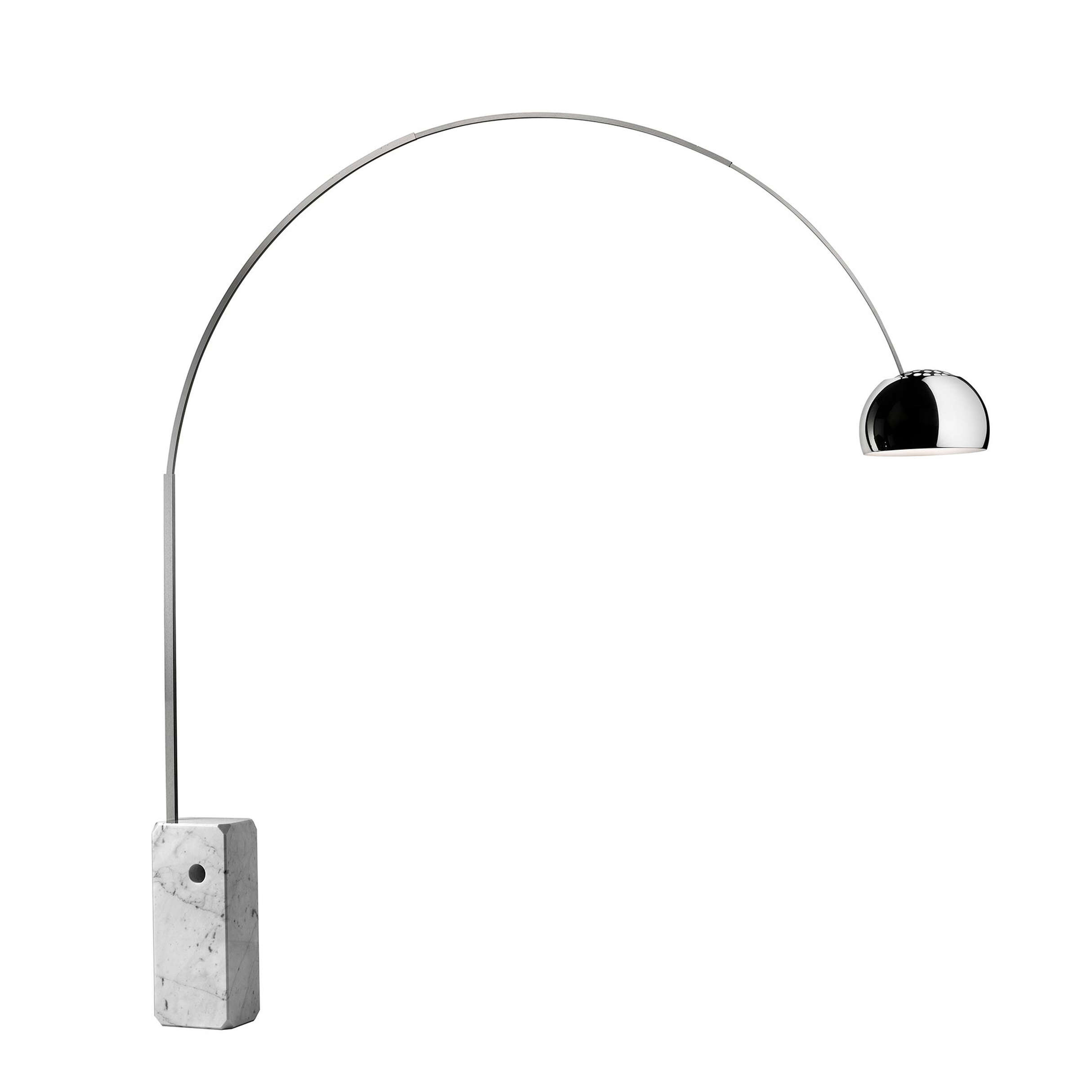 Replica della lampada da terra Arco di Achille e Pier Giacomo Castiglioni (1962). Base in marmo bianco, luce diretta. Stelo telescopico in acciaio inossidabile satinato con sezione rettangolare. Riflettore orientabile in acciaio satinato costituito da due parti semisferiche, una parte fissa forata per non surriscaldare il portalampada, l’altra mobile che si poggia sulla prima parte, modificabile, in base alla lunghezza scelta dello stelo. Dimensioni, alt. 220 cm, prof. 220 cm