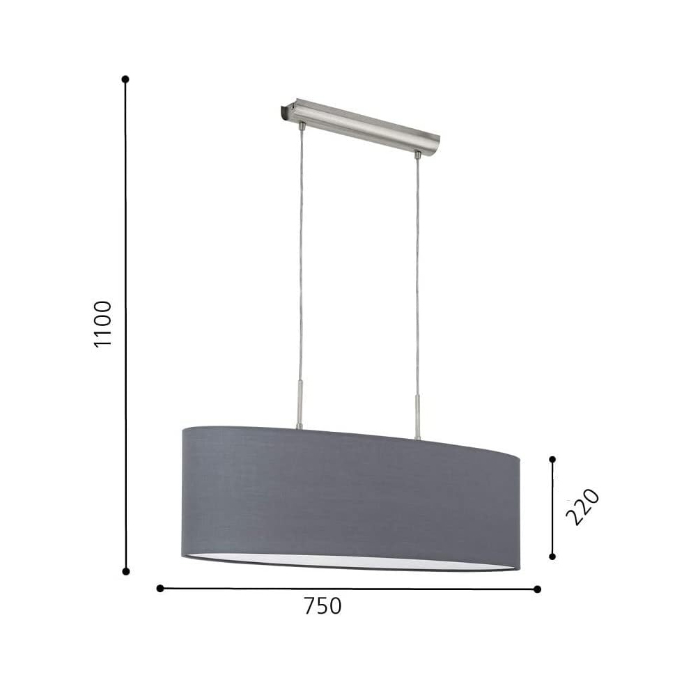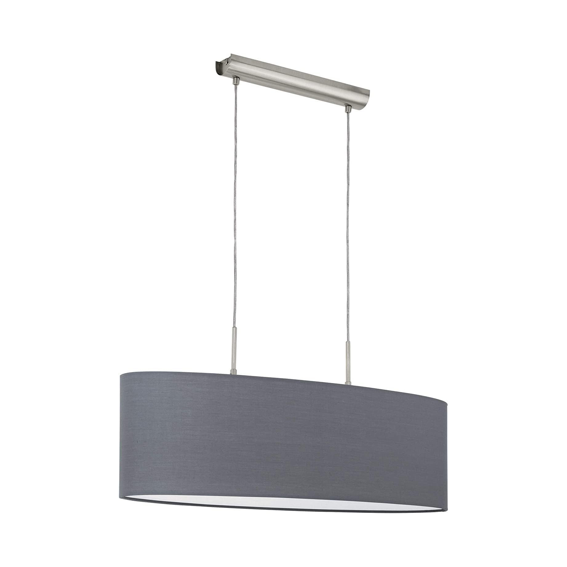 Lampada a sospensione in tessuto a due punti luce, ovale in acciaio colore nichel opaco e tessuto grigio. Il moderno mix di materiali di acciaio in nichel opaco e tessuto grigio garantisce un aspetto classico, accogliente e allo stesso tempo moderno. Dimensioni, altezza: max 110 cm, lunghezza: 75 cm, larghezza: 22 cm