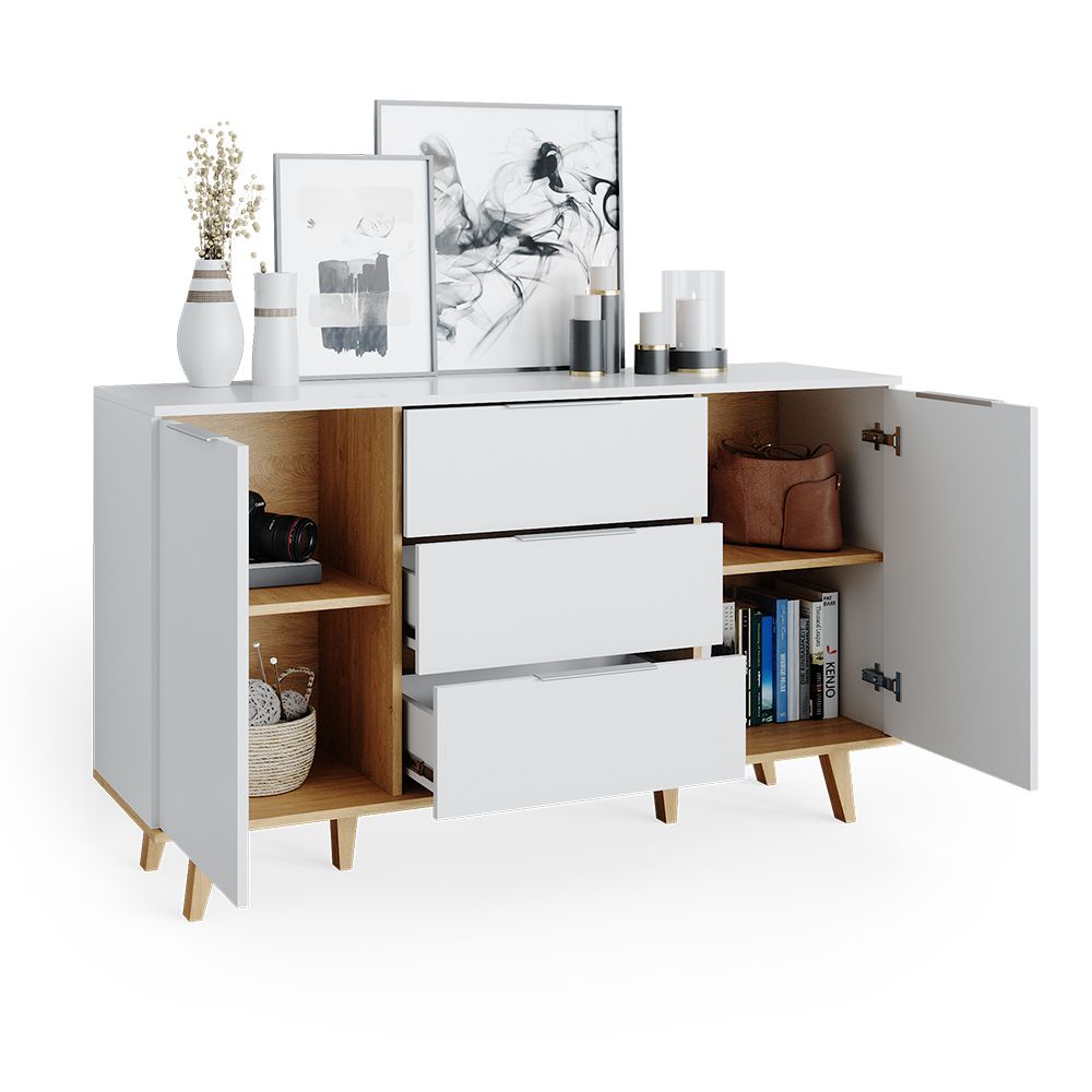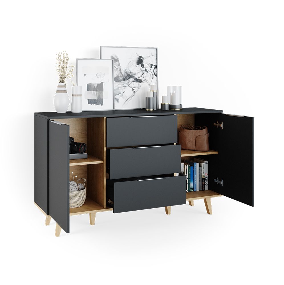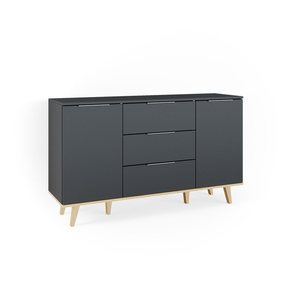 Madia per ufficio dal design scandinavo, ideale per ambienti moderni. Dotata di diverse possibilità di appoggio sia nei tre cassetti, sia nei due scaffali rispettivamente dietro le due ante a destra e a sinistra. Corpo ante e cassetti in truciolato, 16 mm, rivestimento in resina melamminica. Piedini in legno massiccio, 40 mm colore faggio. Disponibile nei colori antracite e bianco. Dimensioni 138 x 82 x 40 cm (ampiezza x altezza x profondità). Peso 44,3 kg