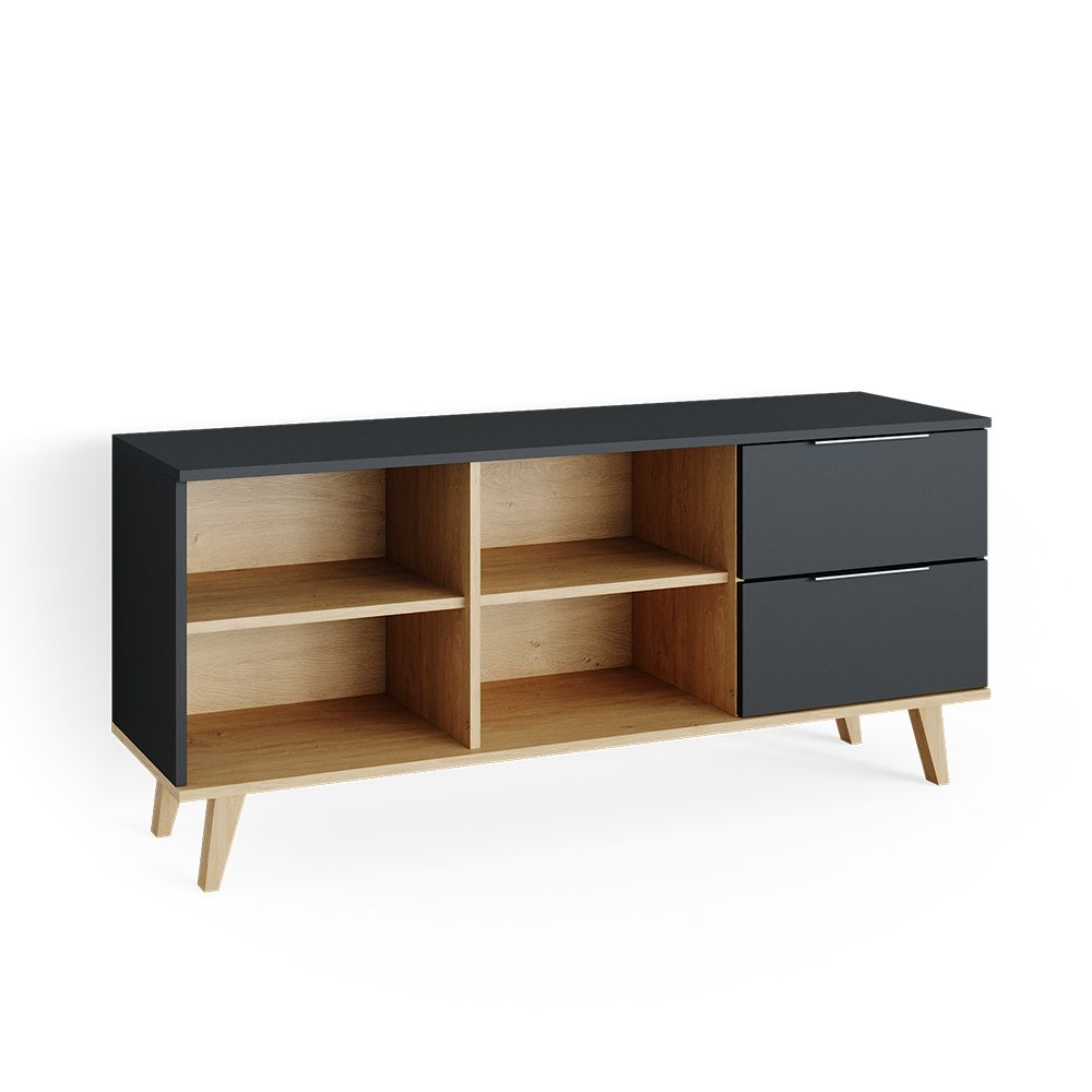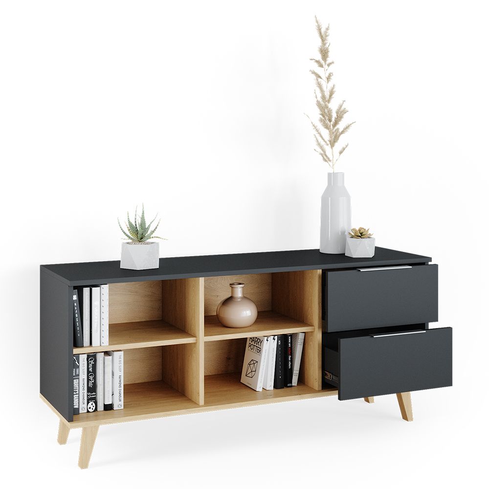 Mobile contenitore dal design scandinavo, ideale per ambienti moderni. Corpo cassetti in truciolato, 16 mm, rivestimento in resina melamminica. Ripiano inferiore e vani a giorno in truciolato 16 mm con rivestimento in resina melamminica colore faggio. Piedini in legno massiccio, 40 mm, faggio. Disponibile nei colori antracite e bianco. Dimensioni 134 x 61 x 40 cm (ampiezza x altezza x profondità). Peso 34,25 kg