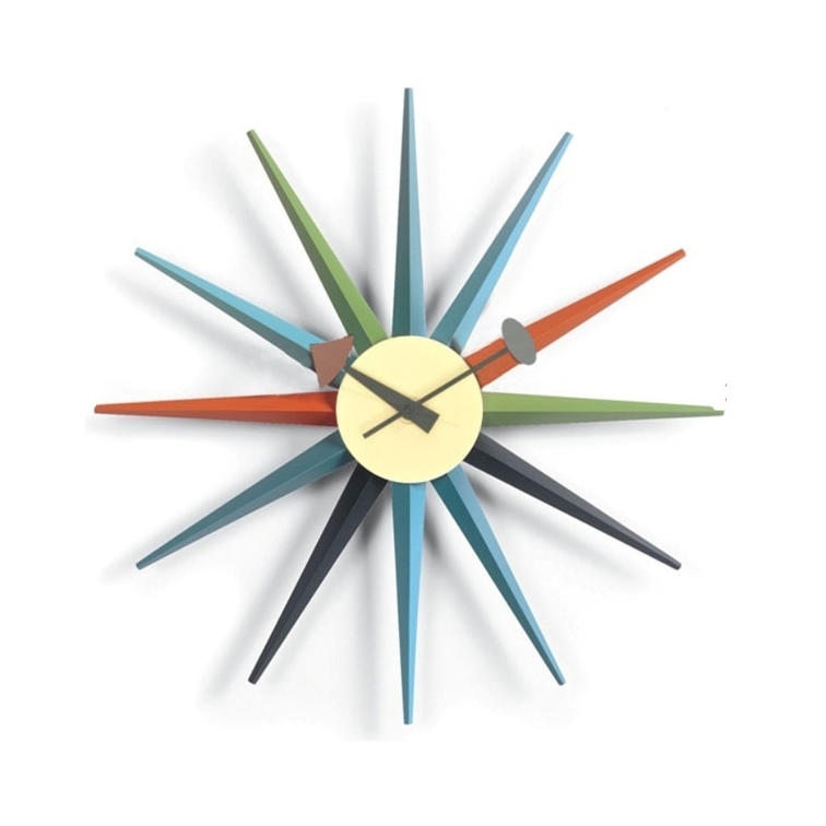 Orologio da parete ispirato al Sunburst clock di George Nelson, icona del design degli anni ’50. Questo moderno orologio da parete si adatta a diversi ambienti dandogli un tocco innovativo e originale. Rifinitura in alluminio laccato con differenti colori. Dimensioni, profondità 5cm, diametro 48cm