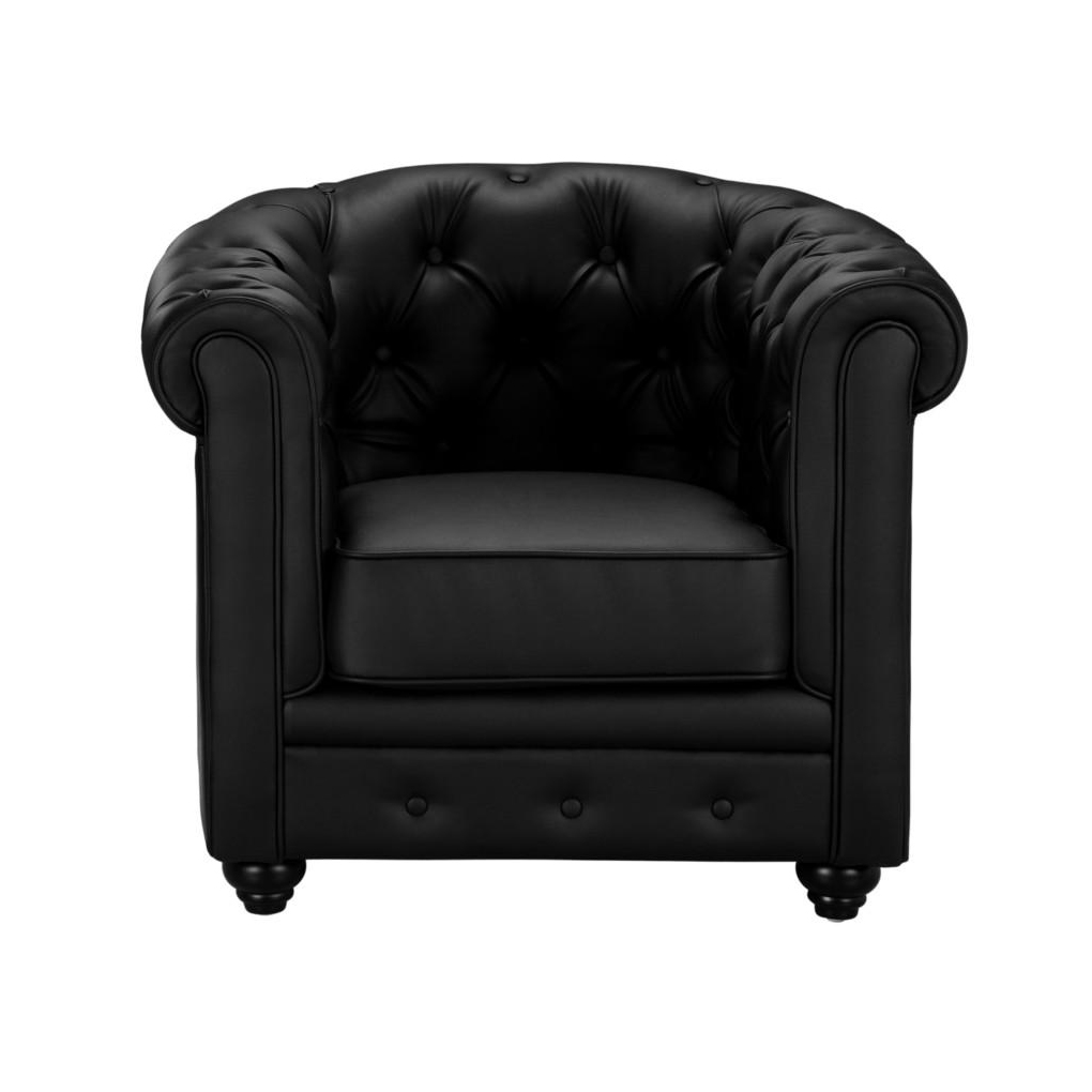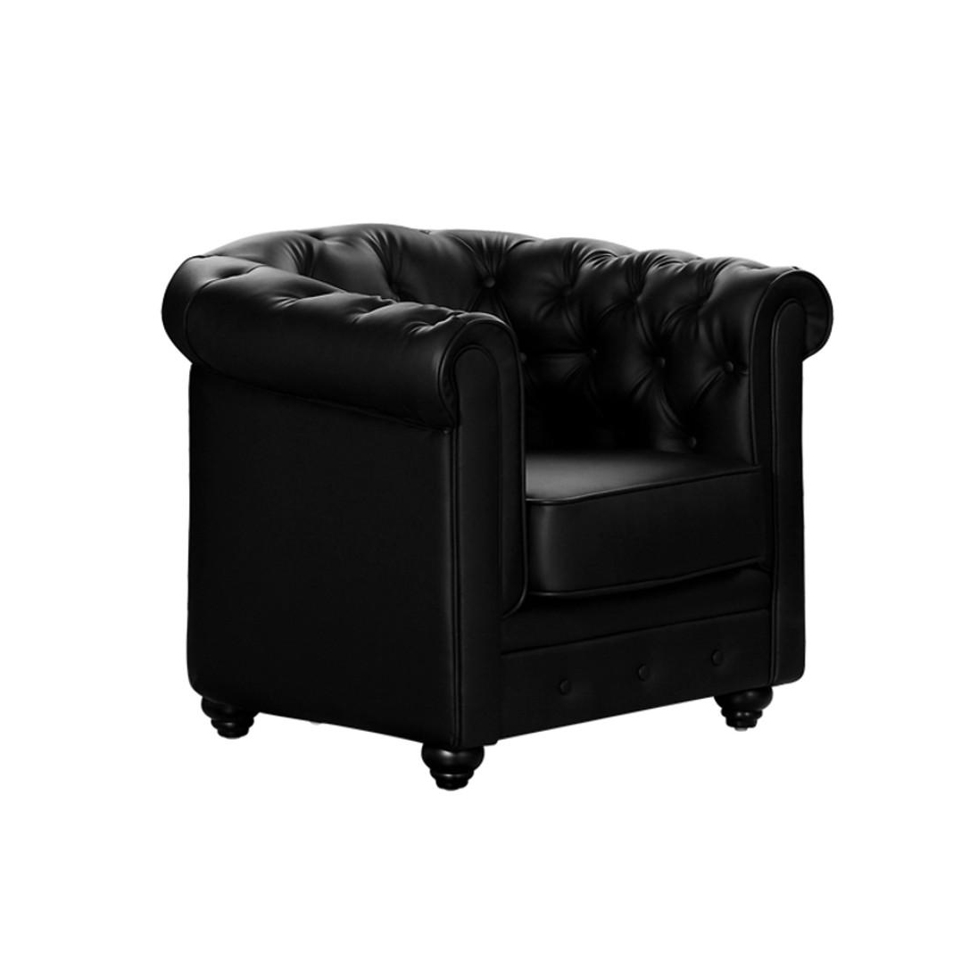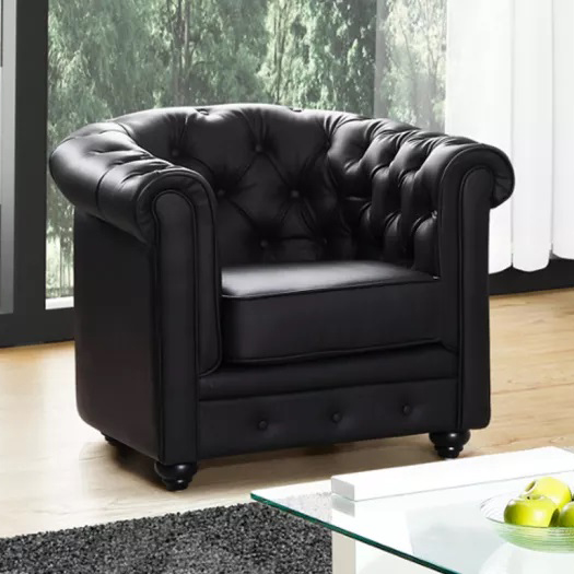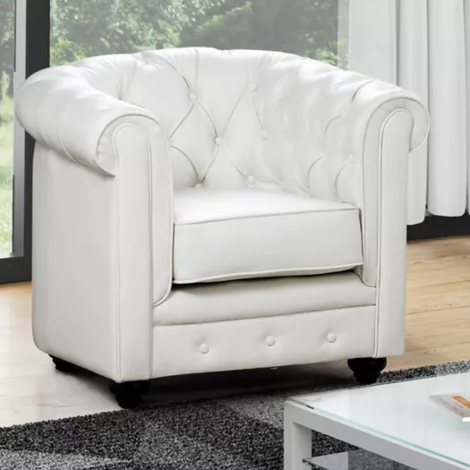 Rivestita interamente in similpelle capitonné. Seduta schienale e braccioli, imbottitI in schiuma poliuretanica con densità 25 kg/m3. Sospensioni della seduta su molle elicoidali, sospensioni dello schienale su cinghie elastiche. Struttura e piedi in legno, cuscino della seduta sfoderabile. Disponibile nei colori bianco e nero. Dimensioni, lungh. 82cm, prof. 78cm, alt. 72 cm