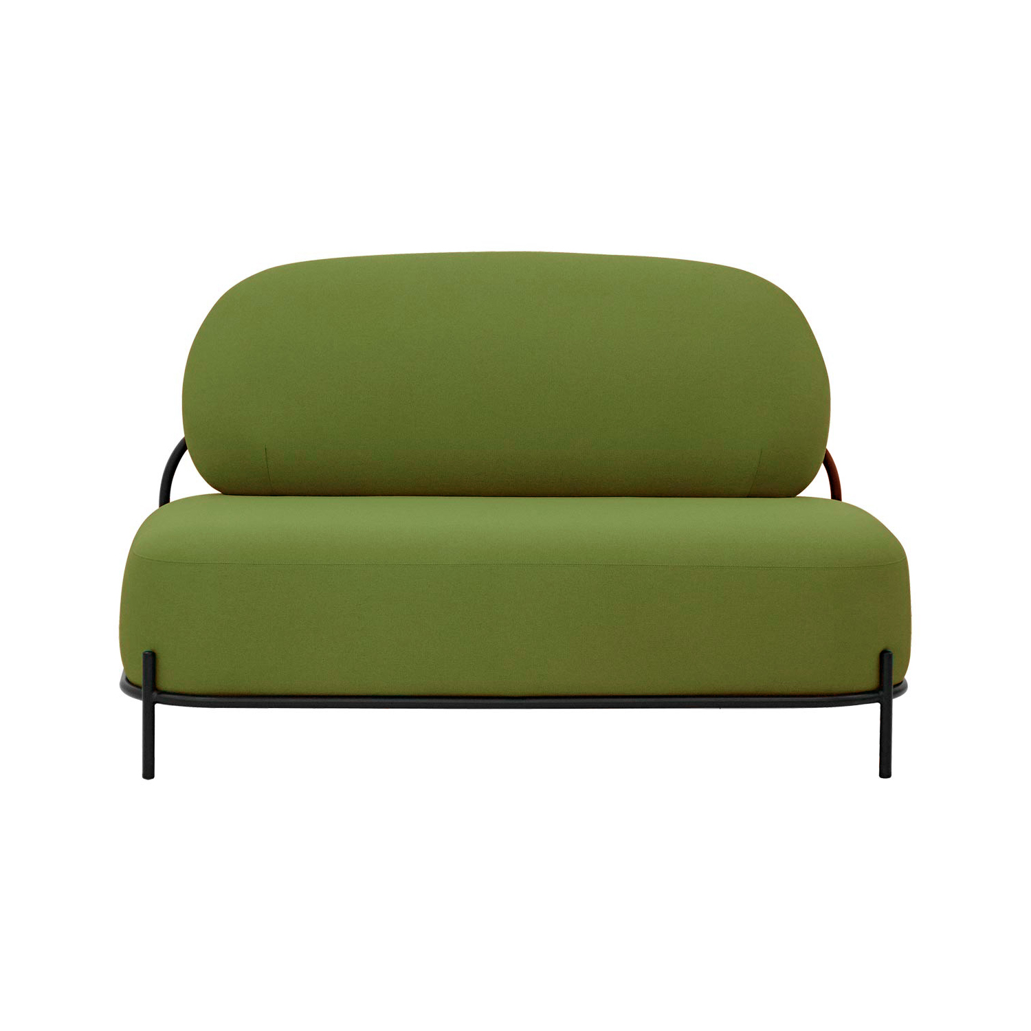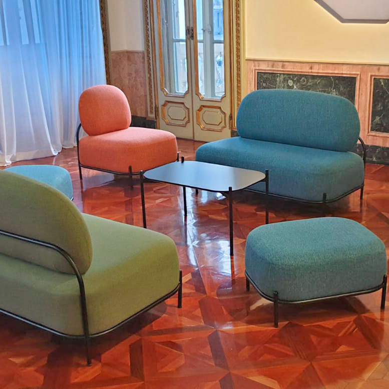 Divano posti con struttura in metallo verniciato , rivestimento in tessuto nei colori bleu, grigio, giallo, verde e arancio. Dimensioni: L. 123 x P. 50 x H. 77. Peso netto : 27,80