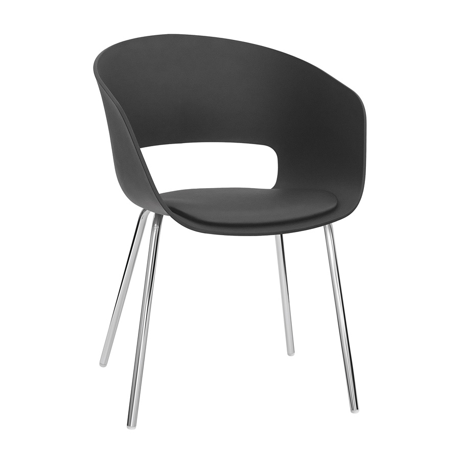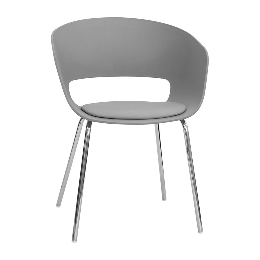 Struttura in metallo cromato, scocca in polipropilene nei colori grigio , bianco, nero, cuscino in ecopelle.