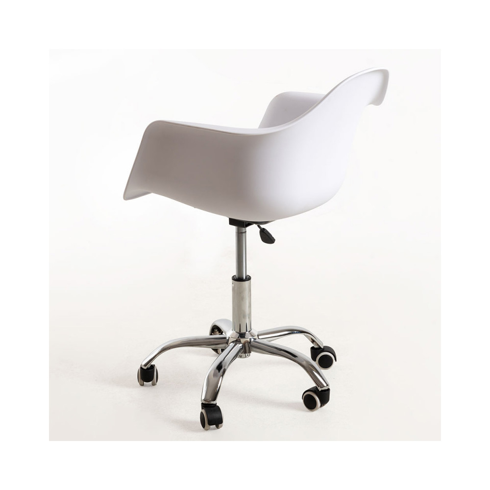Poltroncina da ufficio girevole, regolabile in altezza, ispirata alla famosa sedia Charles Eames. Seduta in polipropilene di colore bianco, dotata di braccioli che raccolgono perfettamente il corpo. Dimensioni 60 x 56 x 88/75 H.