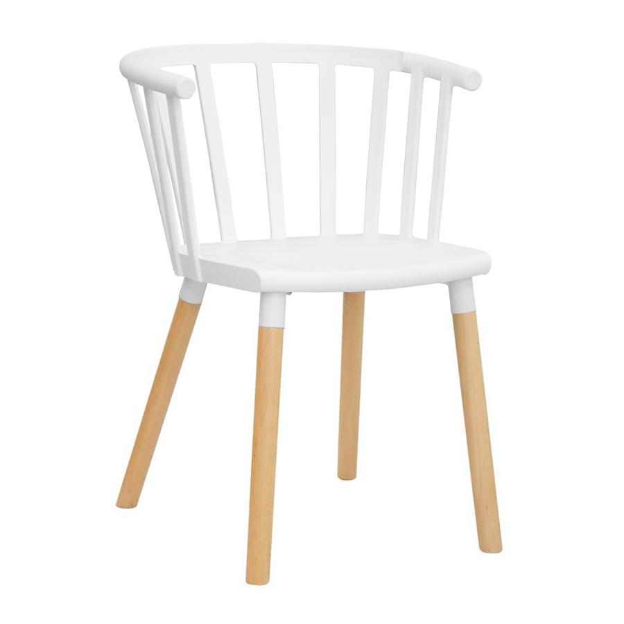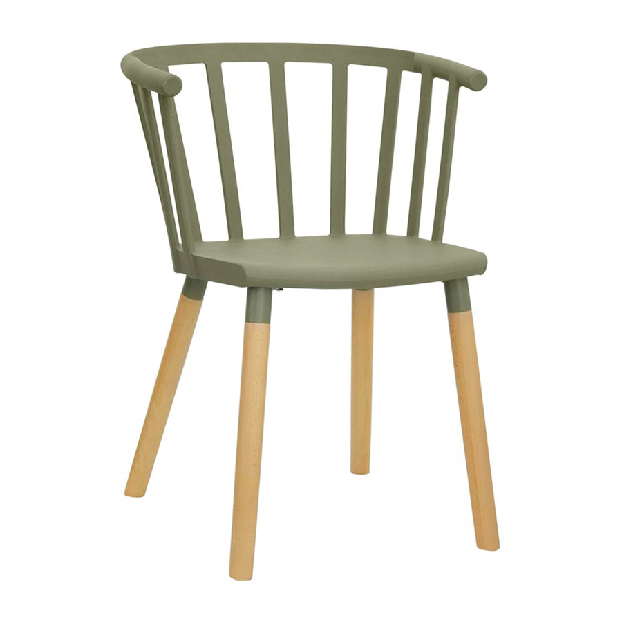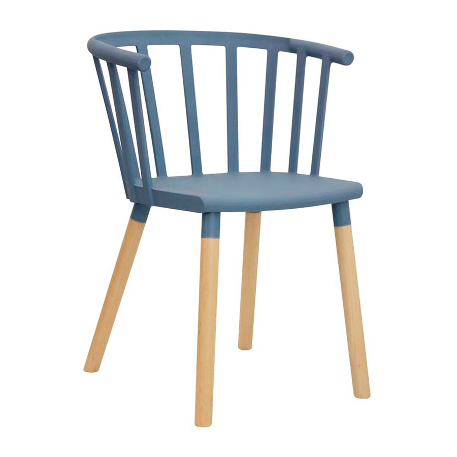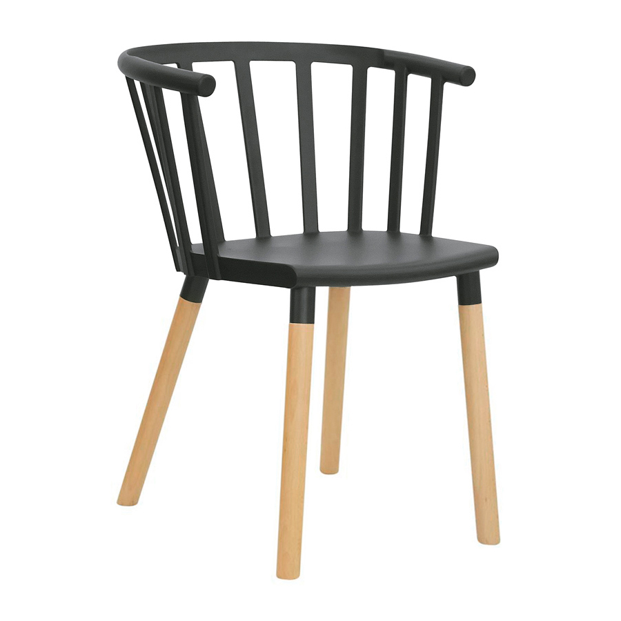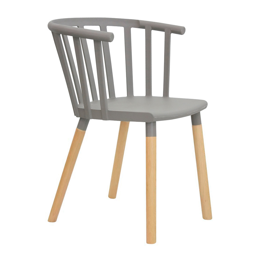 Poltroncina con struttura in metallo verniciato, gambe in legno, scocca in polipropilene in vari colori.