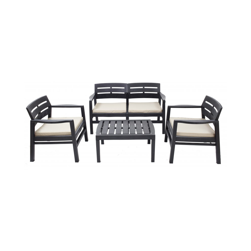 Salotto in resina, composto da n.2 poltrone (63x58x74 cm) con cuscino, divano 2 posti (121x58x74 cm) con cuscino, tavolino basso (74x55x38 cm). Disponibile in colore marrone, antracite e bianco