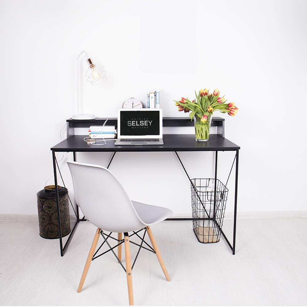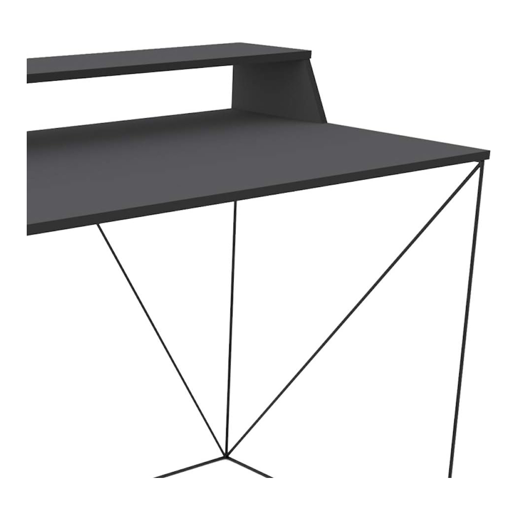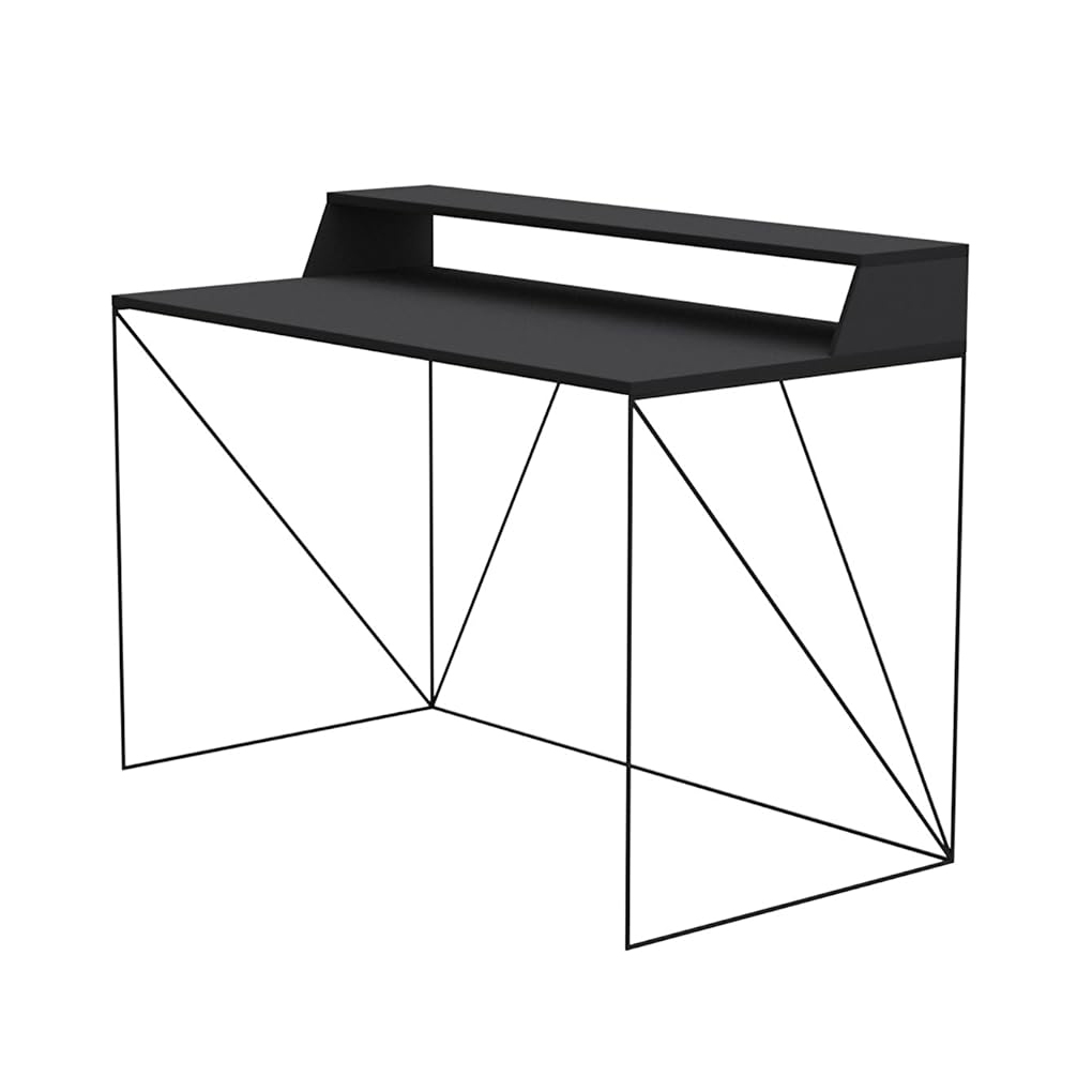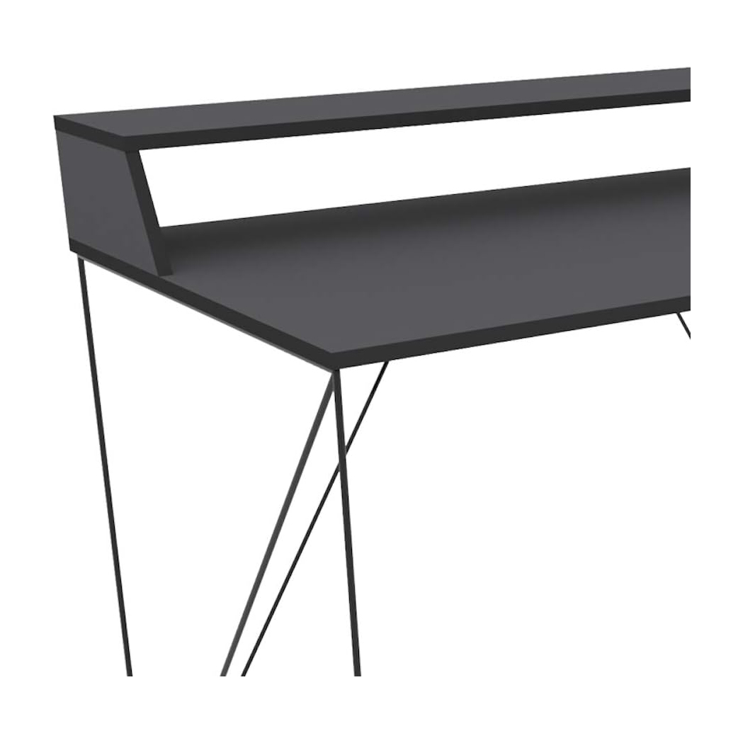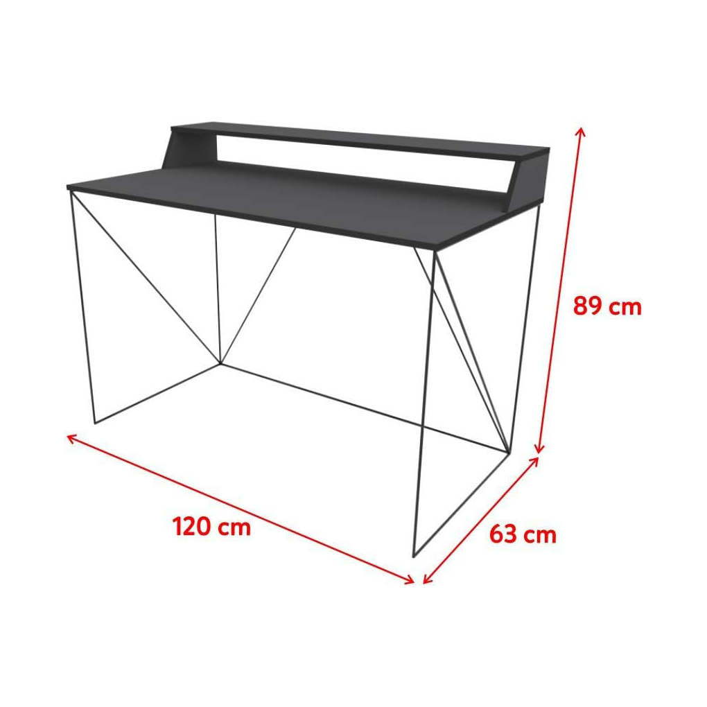 Scrittoio dal design minimalista con un tocco industriale. Rifinitura del piano in MDF laminato con protezione bordi in PVC, colore grigio antracite. Completo di un pratico inserto come ulteriore superficie d’appoggio. Struttura delle gambe in acciaio colore nero. Dimensioni: larghezza 120 cm, profondità 63 cm, altezza piano di lavoro 75 cm, altezza totale 89 cm.