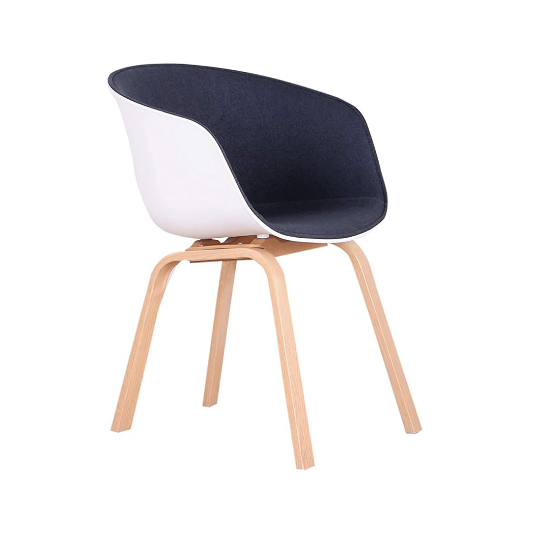 Sedia dal design ergonomico, adatta per ambienti living, soggiorno/paranzo, lo schienale curvo e i braccioli forniscono un forte supporto per tutta la schiena, offrendo comfort e relax quando si è seduti. La seduta è realizzata in polipropilene con imbottitura interna in tessuto, le gambe sono realizzate in metallo rifiniti colore legno. Dimensioni della sedia: altezza totale: 83 cm; altezza della seduta: 44 cm; profondità della seduta: 56 cm; larghezza della seduta: 60 cm.