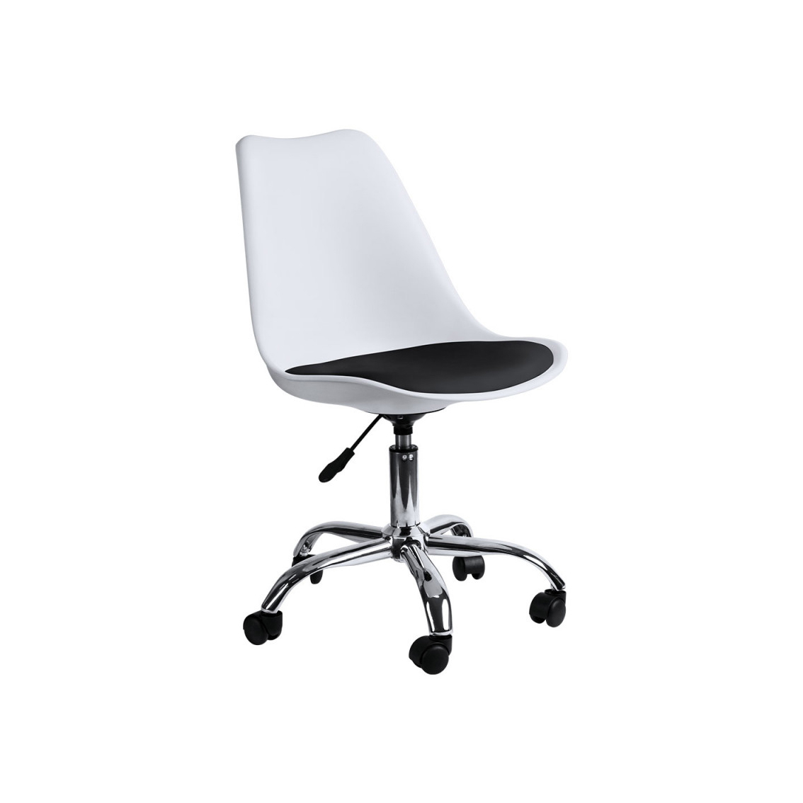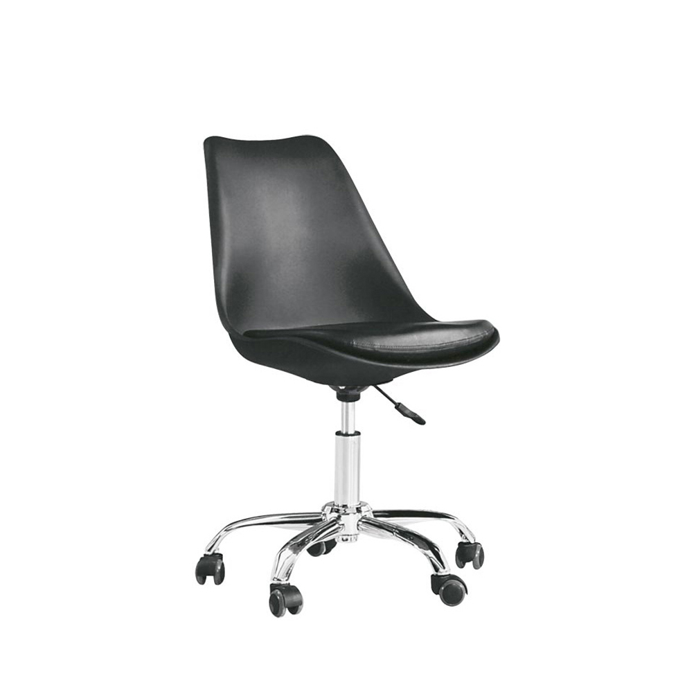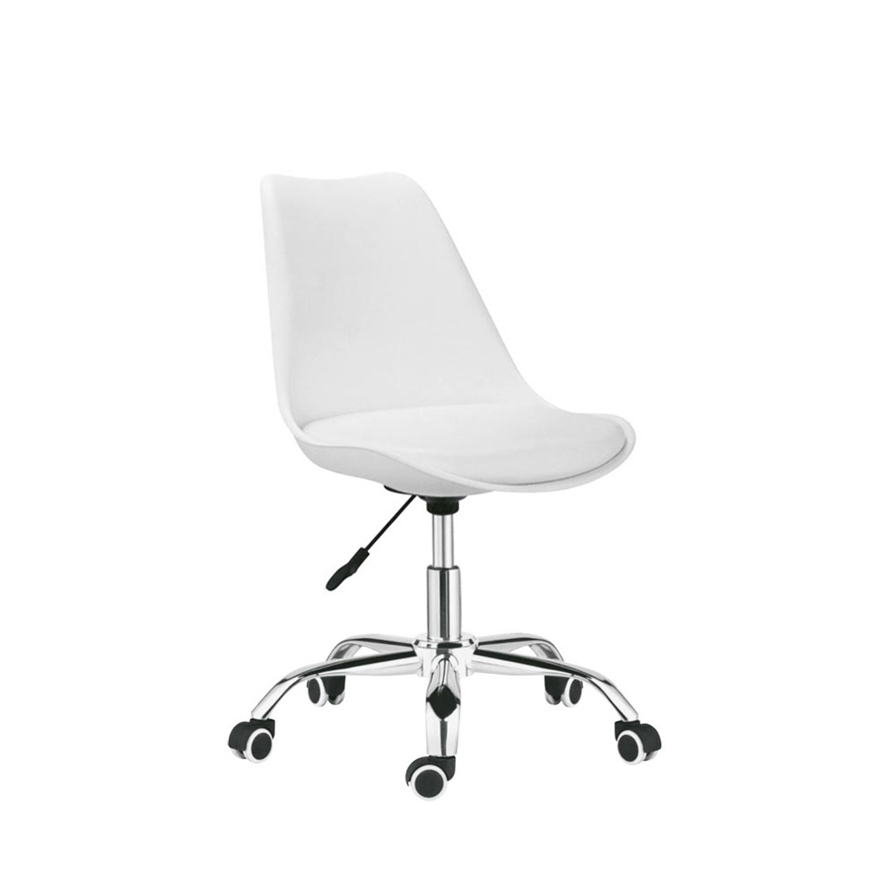 Sedia per ufficio regolabile in altezza con seduta in polipropilene e cuscino imbottito in similpelle. Base in metallo laccato con 5 ruote, facilita il movimento della sedia e offre all’utente un’ottima libertà di movimento. Disponibile nei colori, bianco, bianco con cuscino nero, nero, rosso, giallo, grigio e verde. Dimensioni, altezza 80/89 cm , larghezza 42cm, alt. seduta 43/54 cm.