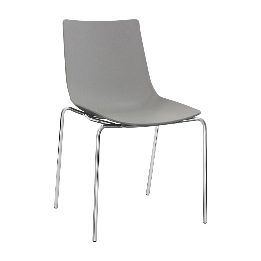 Sedia ” impilabile ” con struttura in metallo cromato, scocca in polipropilene nei colori bianco, nero, rosso, grigio.