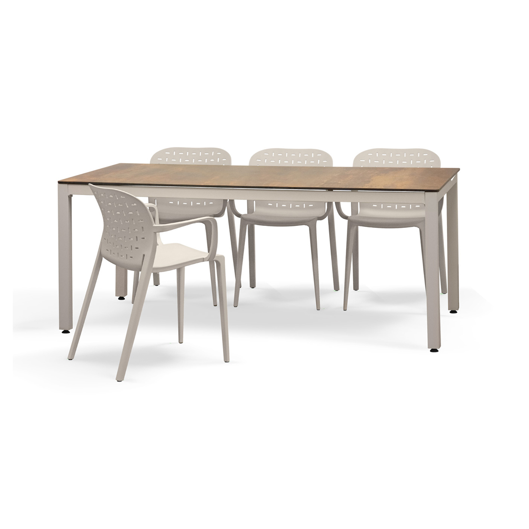 Set da pranzo per esterno composto da quattro sedie con struttura in polipropilene e fibra di vetro in vari colori ed un tavolo rettangolare con struttura in allumino verniciata a polvere e piedini regolabili. Top in stratificato HPL “EXTRA” spessore 12 mm in varie finiture. Dimensione sedia alt. 78,5cm, largh. 40cm, prof. 42cm, alt. seduta 47cm. Dimensione tavolo 180x90x75