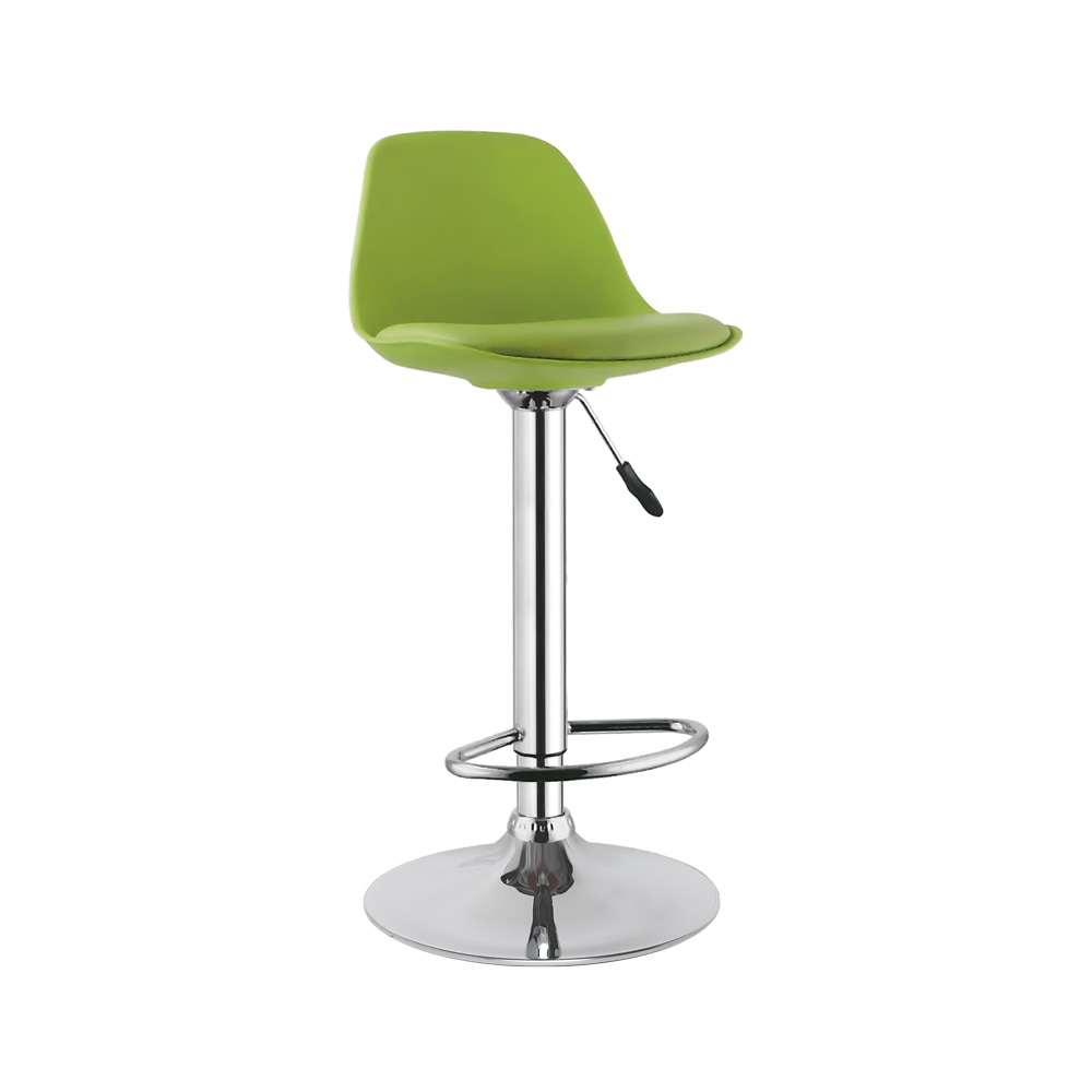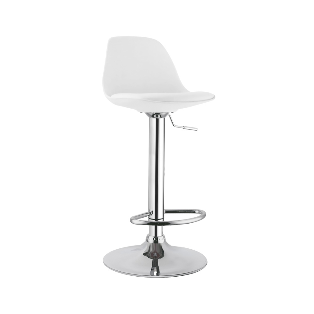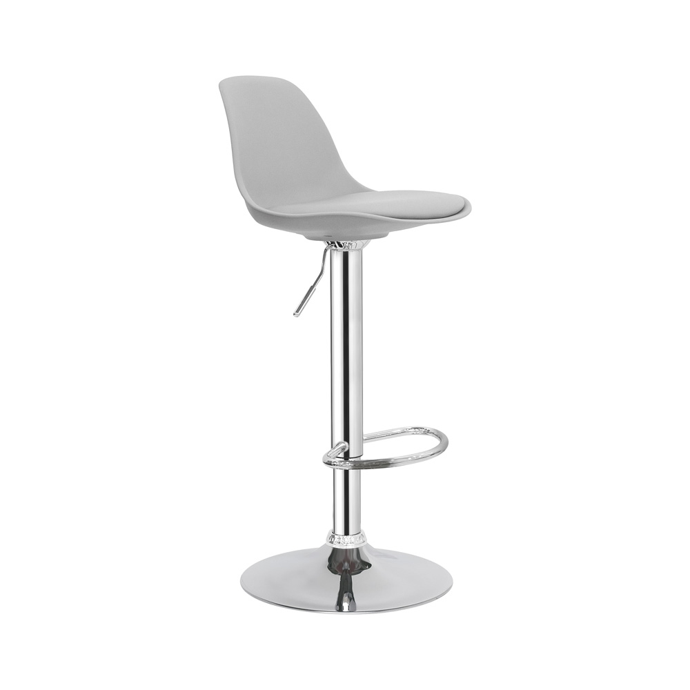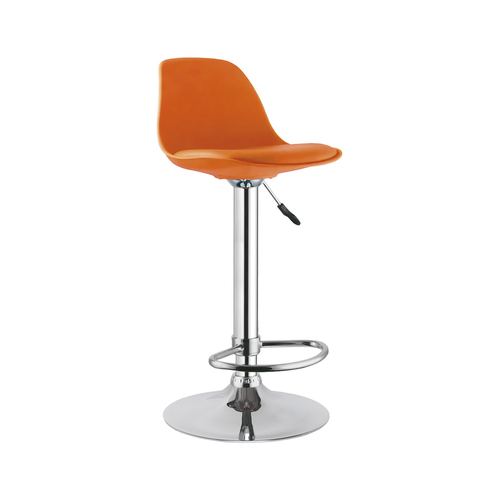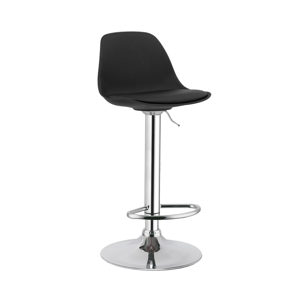 Sgabello con struttura in metallo cromato con sospensione a gas, seduta in polipropilene, cuscino in ecopelle in vari colori.
