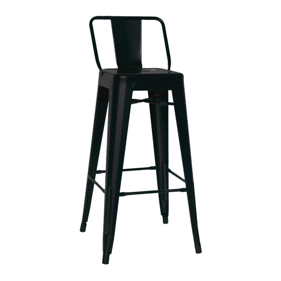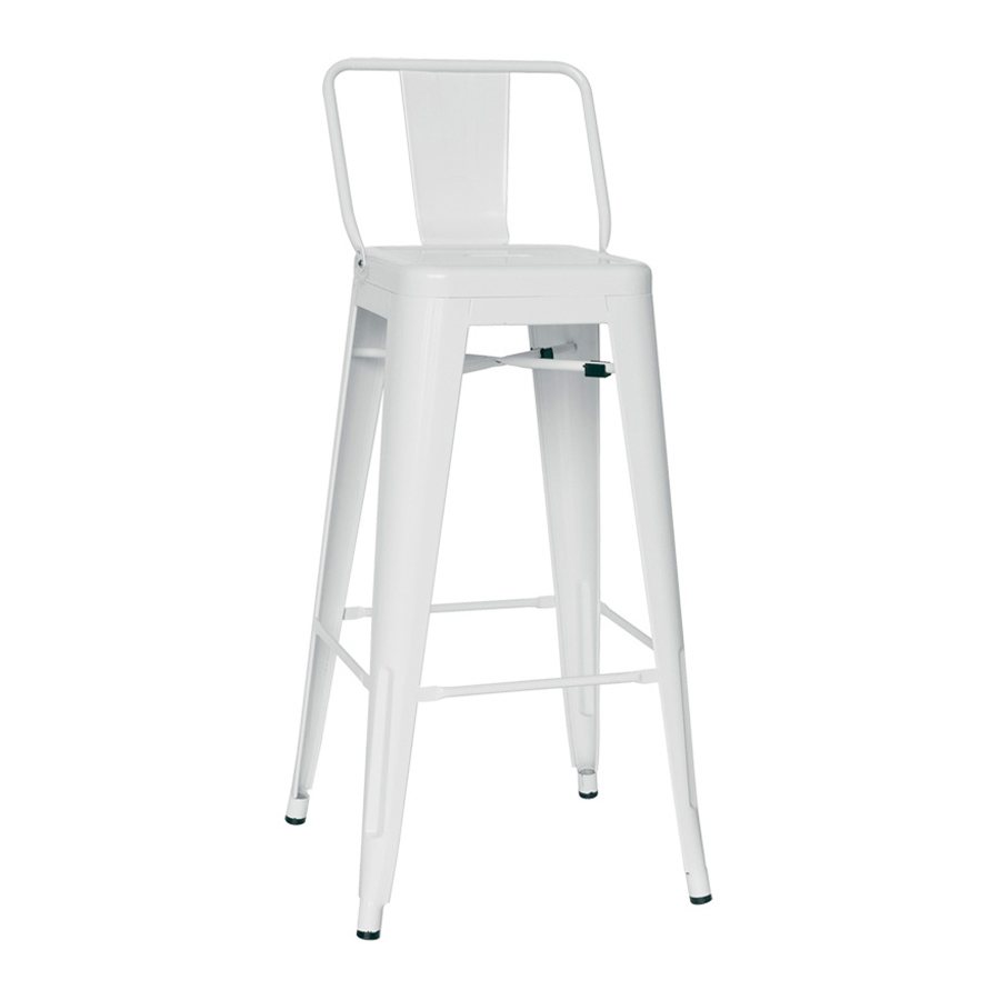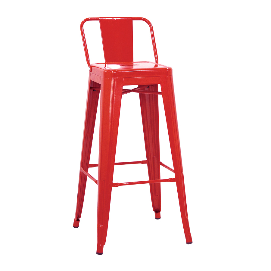 Sgabello alto con schienale e struttura in metallo verniciato nei colori bianco, rosso, nero.