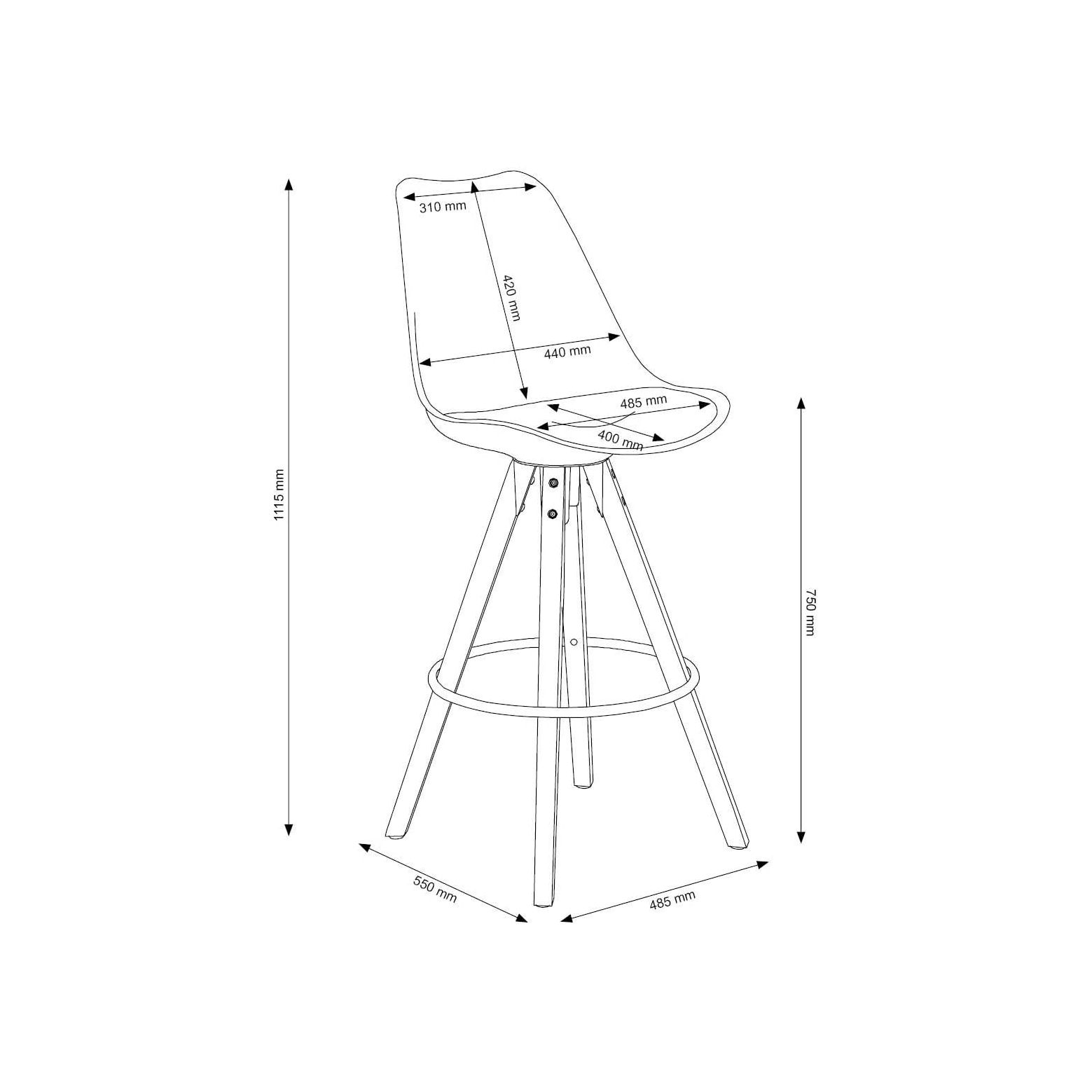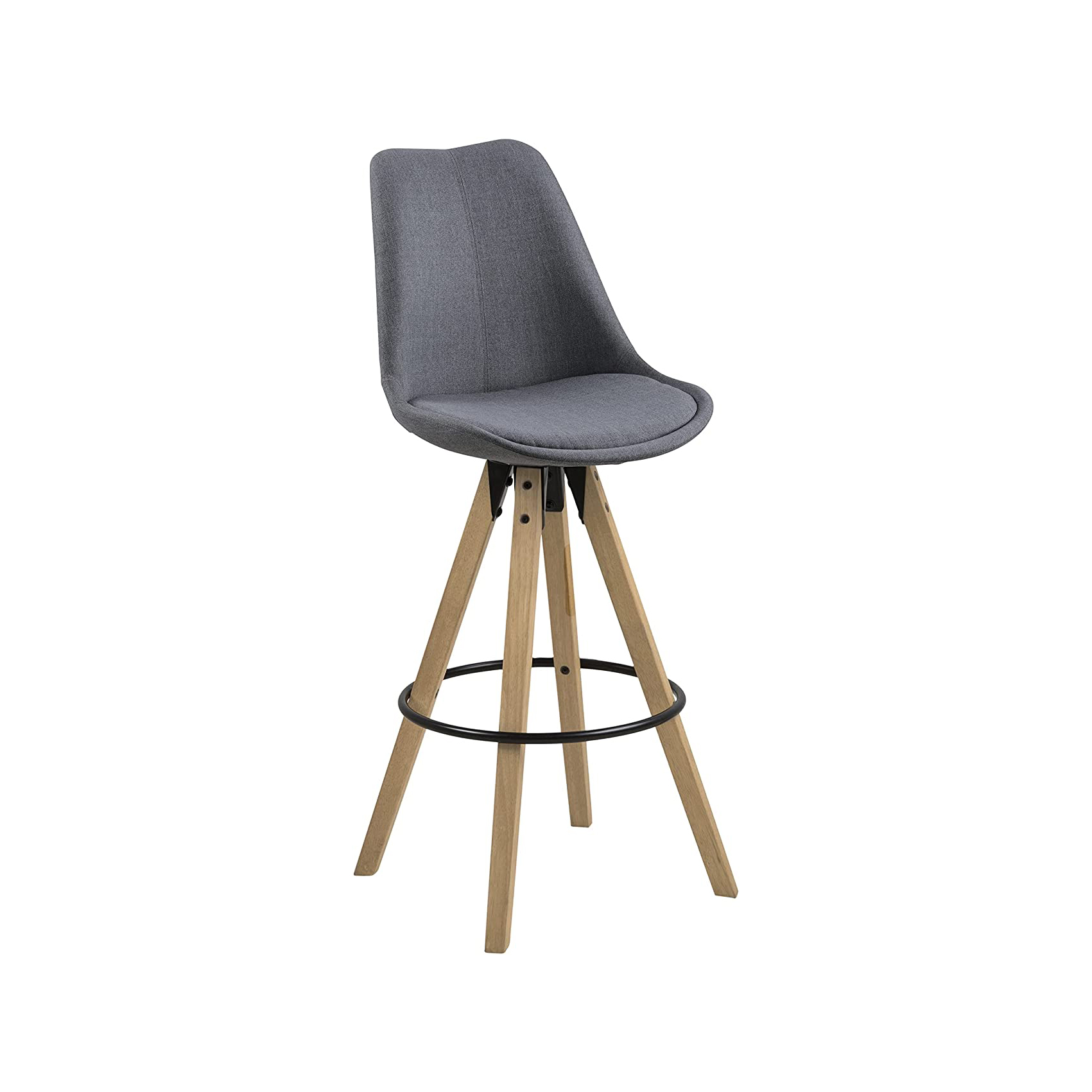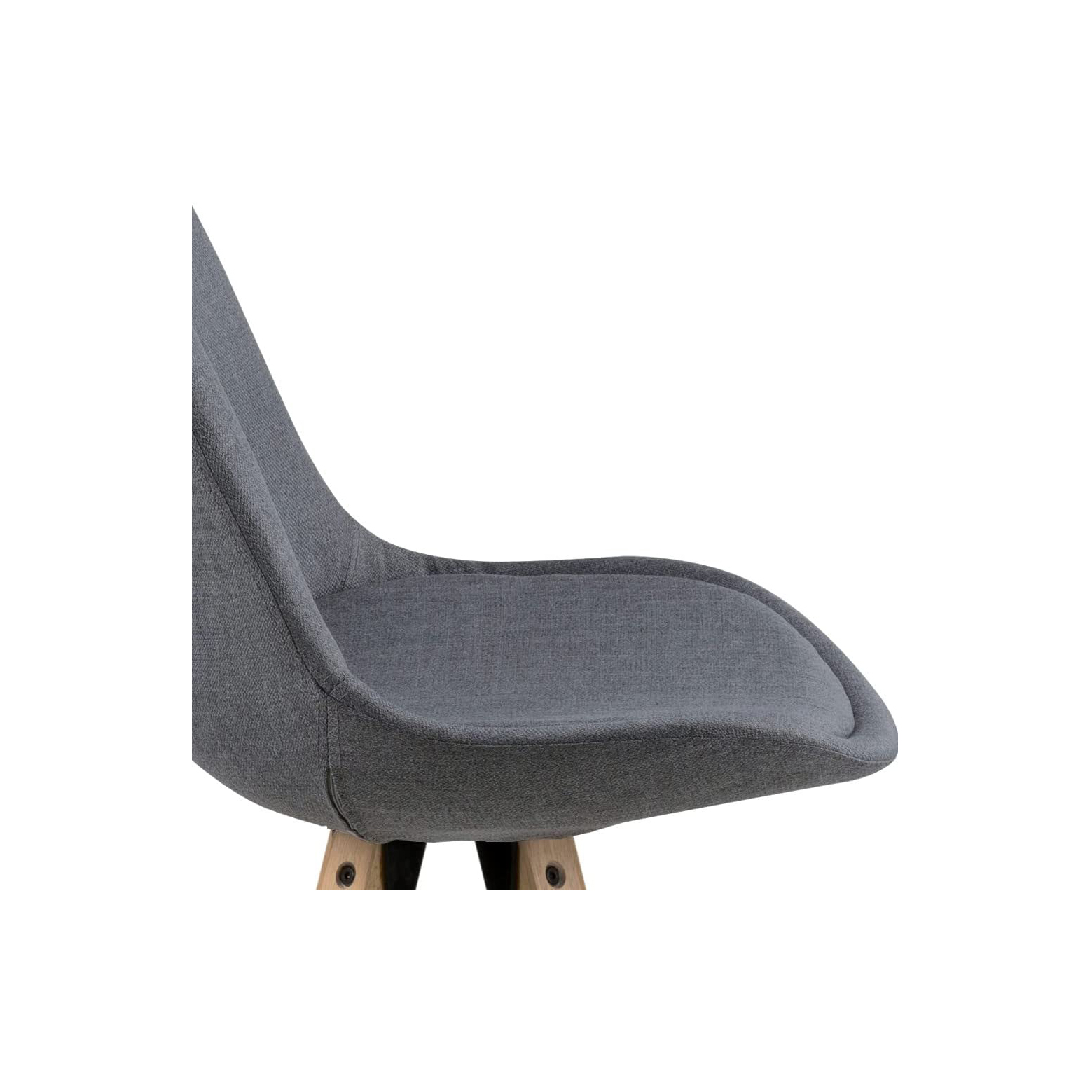 Sgabello dallo stile scandinavo, seduta confortevole e modellata per favorire una postura corretta. Caratterizzato da un rivestimento della seduta in tessuto grigio scuro, gambe in massello colore quercia e poggiapiedi in metallo nero.