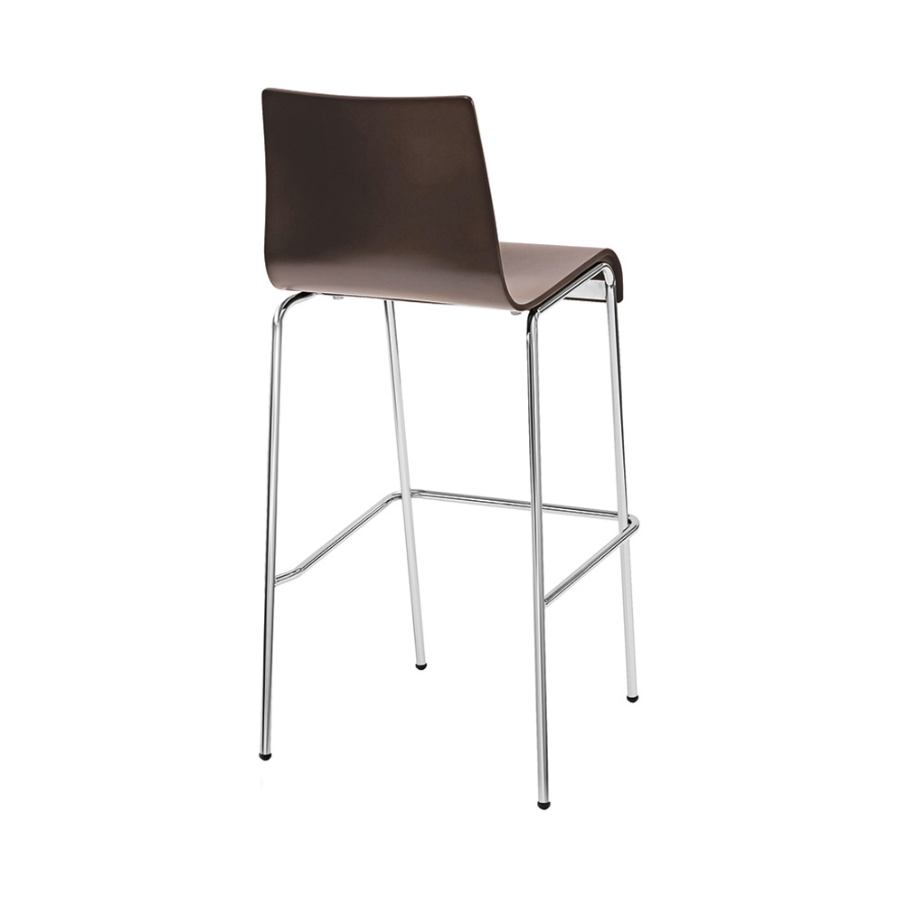 Sgabello con struttura in metallo cromato, scocca in legno multistrato. Disponibile nelle finiture colori legno trasparente e legno wenghe. Dimensioni alt. 102, prof. 40, alt. sed. 75 cm
