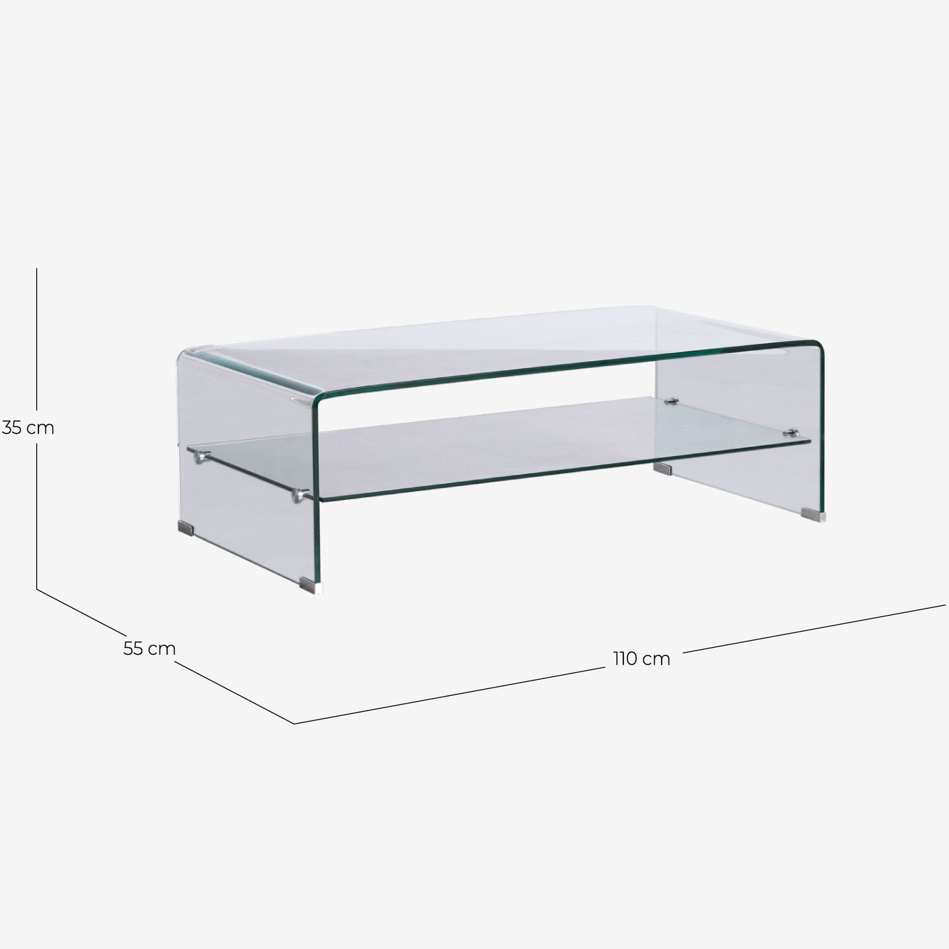 Tavolino rettangolare in vetro spessore 12 mm. Caratterizzato da uno strato esterno di cristallo curvato agli angoli e un piano in cristallo intermedio utile per appoggiare accessori come riviste o il telecomando TV.