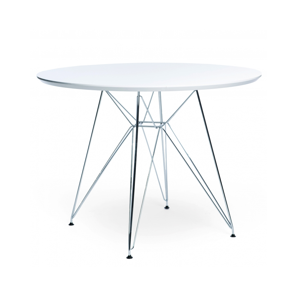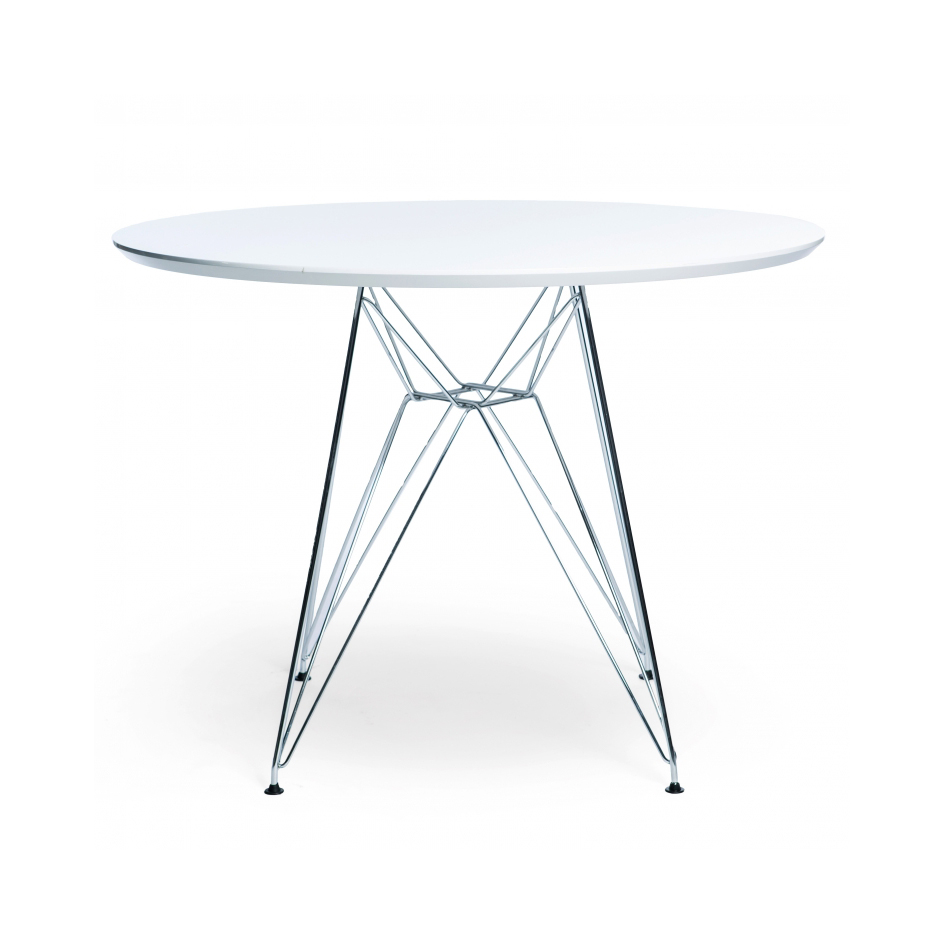 Replica de tavolo di Charles & Ray Eames, quattro posti, piedi in acciaio cromato e superficie del tavolo in MDF laccato bianco. Un elemento essenziale dell’arredamento, riesce a dare un tocco di design alla casa o all’ufficio. Dimensioni, diametro 100 cm., altezza 74 cm.