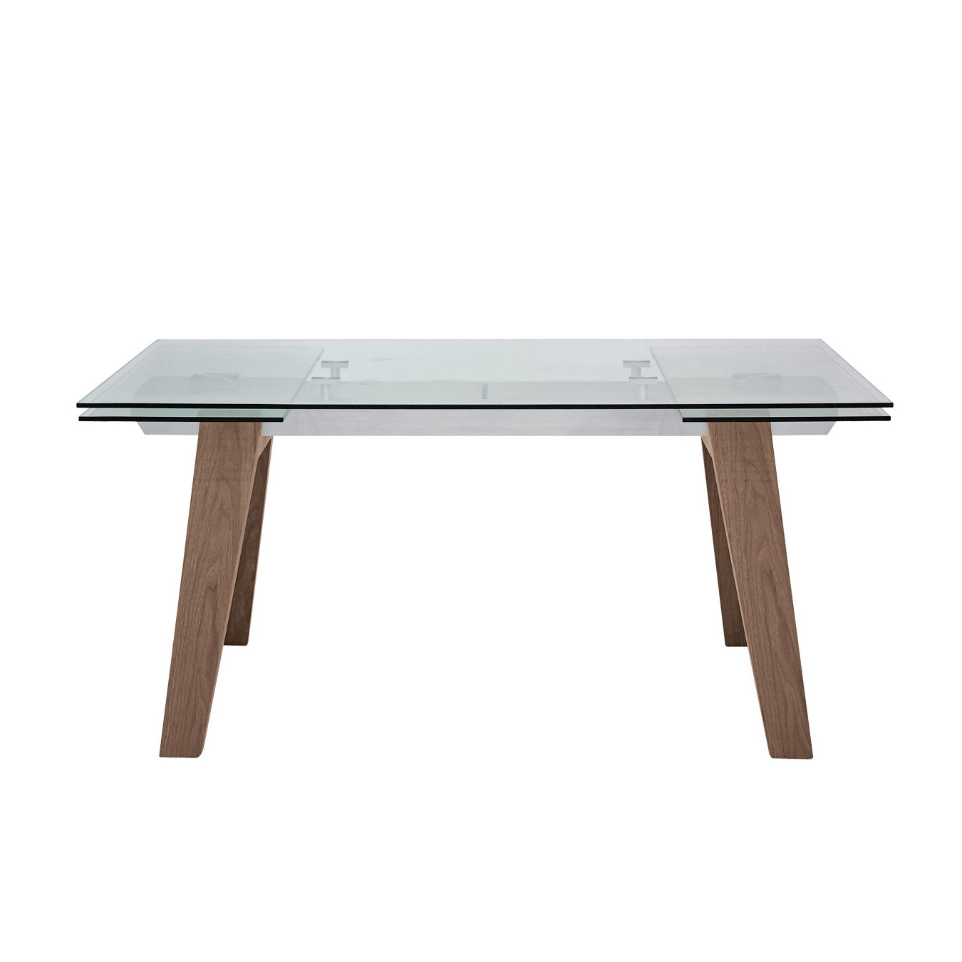 Tavolo allungabile 6/10 posti rettangolare con struttura in alluminio, gambe in legno, piano in cristallo spessore 10 mm.